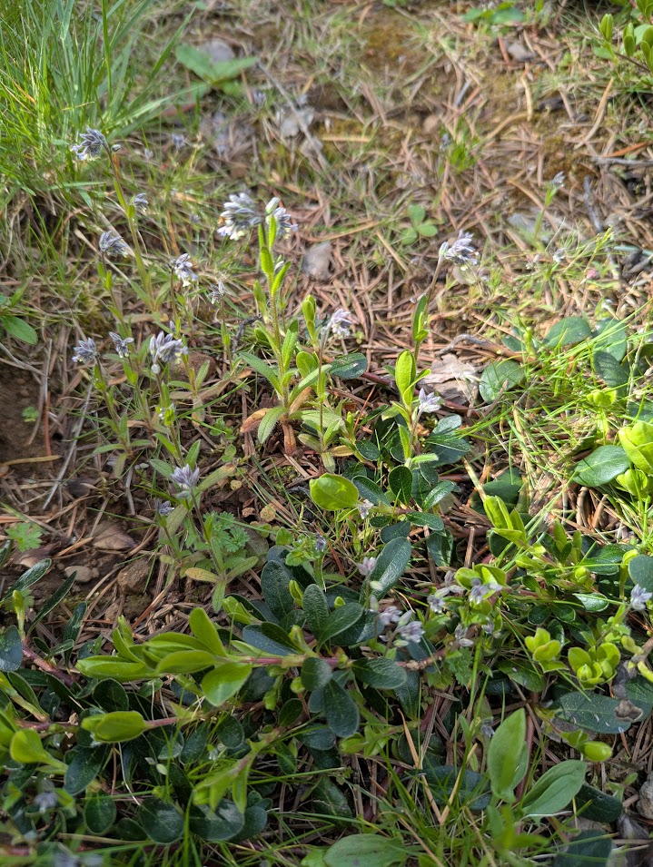 Changing forget-me-not. Myotis acetosella. Introduced. This is such a pretty plant! The flowers are tiny, they change from blue to yellow, and the entire plant resembles a miniature forget-me-not but doesn’t grow much taller than the neighboring lawn grass. I leave it in the front yard (which is basically a haven for weeds much to the dismay of neighbors who love a monoculture grass lawn, especially out front. Sometimes I find it in the back lawn. It seems to like to grow in the grasses.