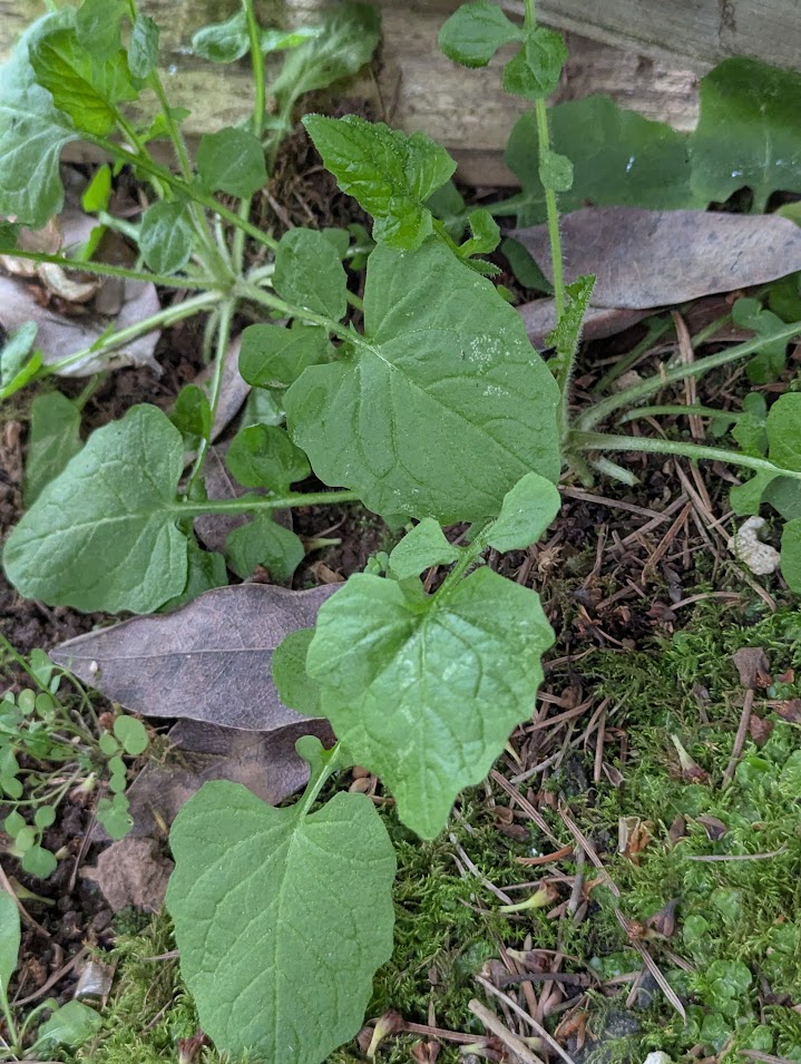 Common nipplewort. Lapsana communis. Has tine, pretty, yellow flowers if it lives long enough top bloom. It grows around 12” tall, competes with everything, and I do not like it. Fortunately, it has a shallow root system and is easily pulled. It is also considered an invasive introduced species. I try not to give it too much leeway to expand in my yard. It does happen to be edible and useful as a herb, which makes it not all that nasty of a backyard weed.