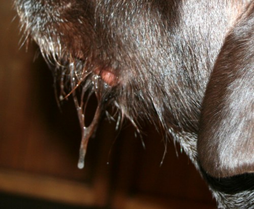 He almost looks like my mother-in-law’s German Shepherd, he’s so sad. Look at the gob of slimy drool.