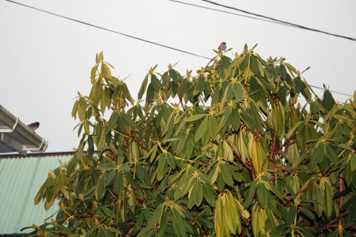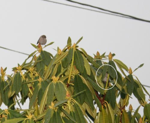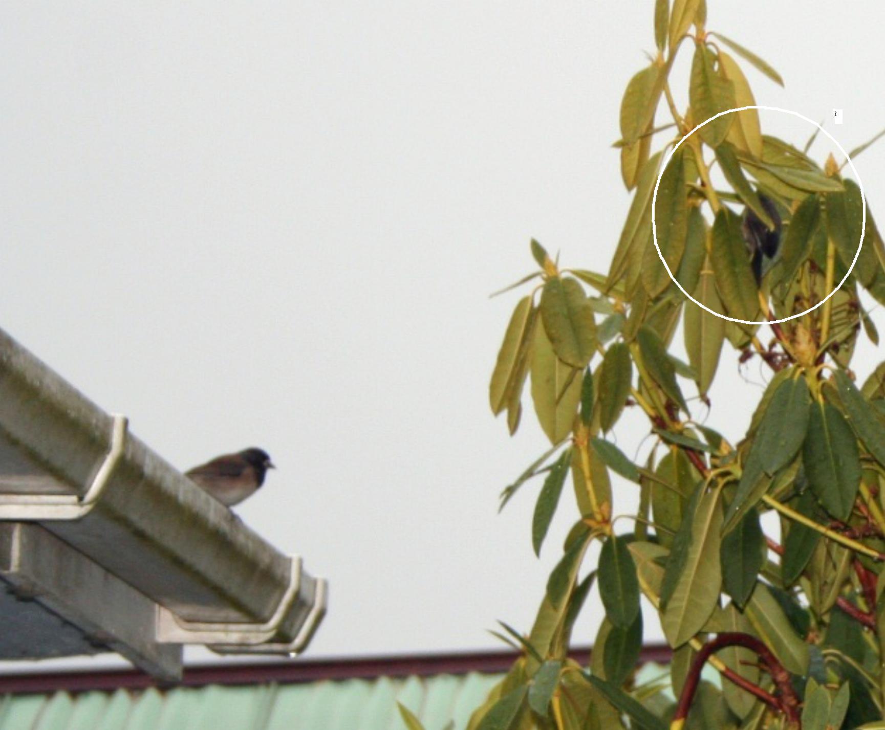 I got the obvious birds in my lens: one dark-eyed junco on the eave and a bushtit in the rhododendron.