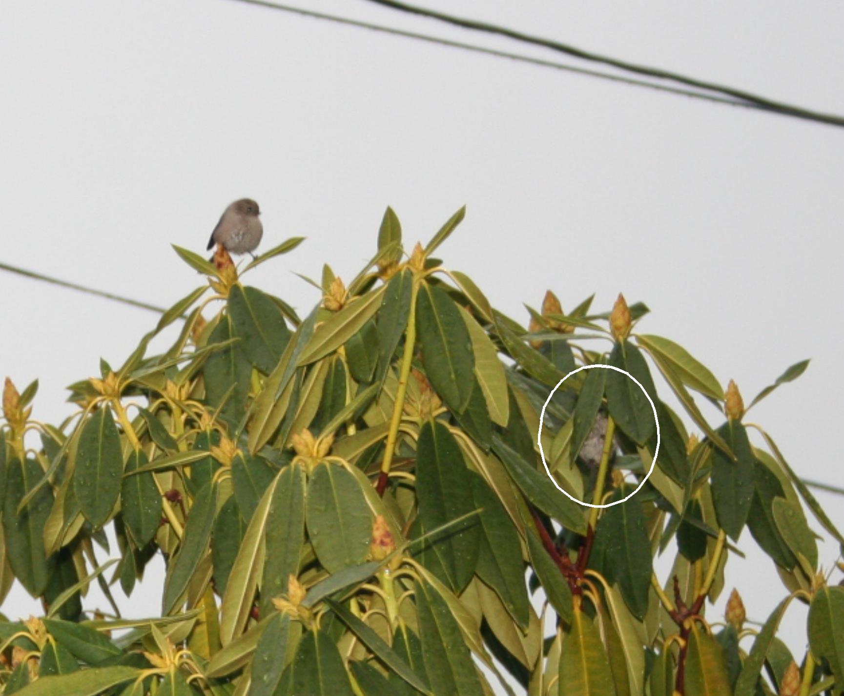 When I uploaded the photo, however, I discovered two more bushtits in the rhododendron:
