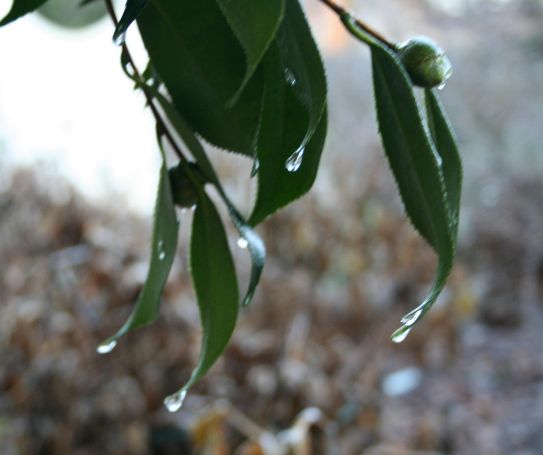 Woke up this morning to frozen rain drops. It was not a heavy rain, but just enough to coat the world in slippery ice and leave drops suspended on the tips of the camelia leaves.
