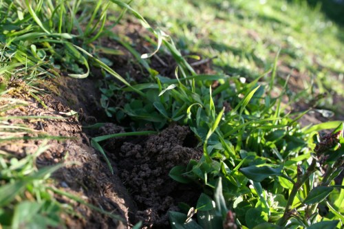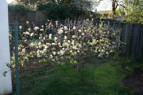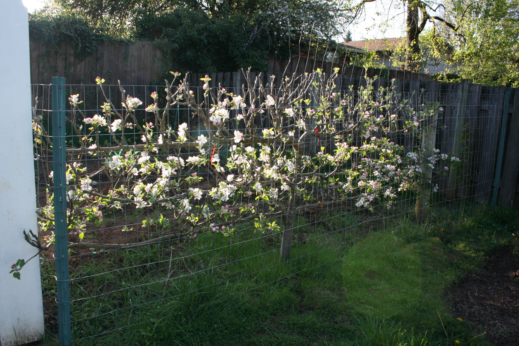 Originally, they were on this side of the garden fence but we discovered that Murphy loves apples. He’ll eat all the green apples off the tree. So we moved the fence to protect the apples. A fence probably seems redundant since the espalier forms a fence, too, but – again: Murphy.