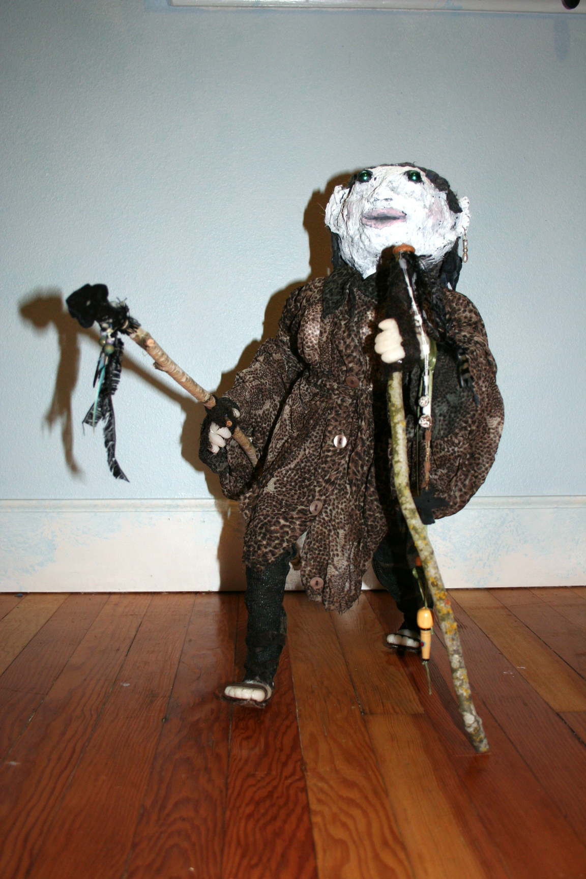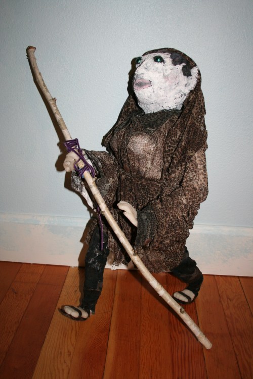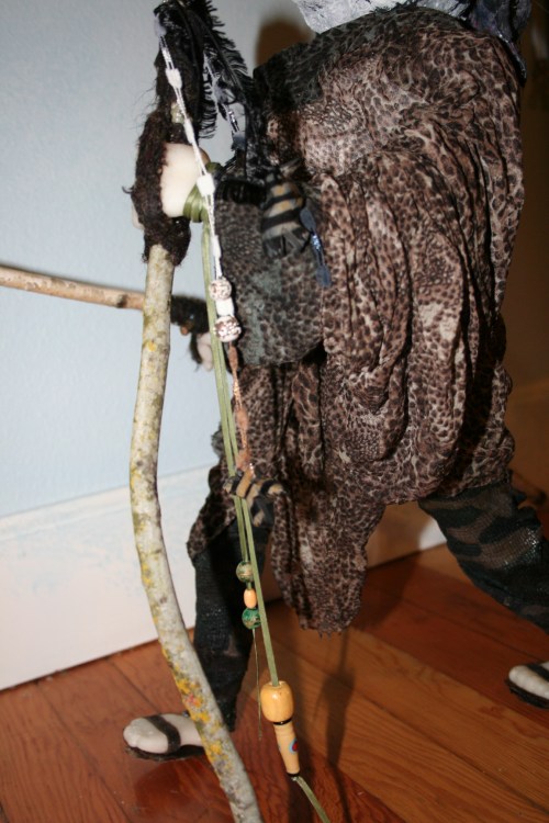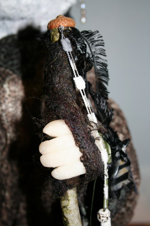 The “cap” to her staff is an acorn cap. The yarn I had on hand (both kinds). And that cool suede-looking “leather” hand band? That’s an old wool sweater I picked up at a yard sale that was pocked with miller damage. Sure looks like some dead animal hide!