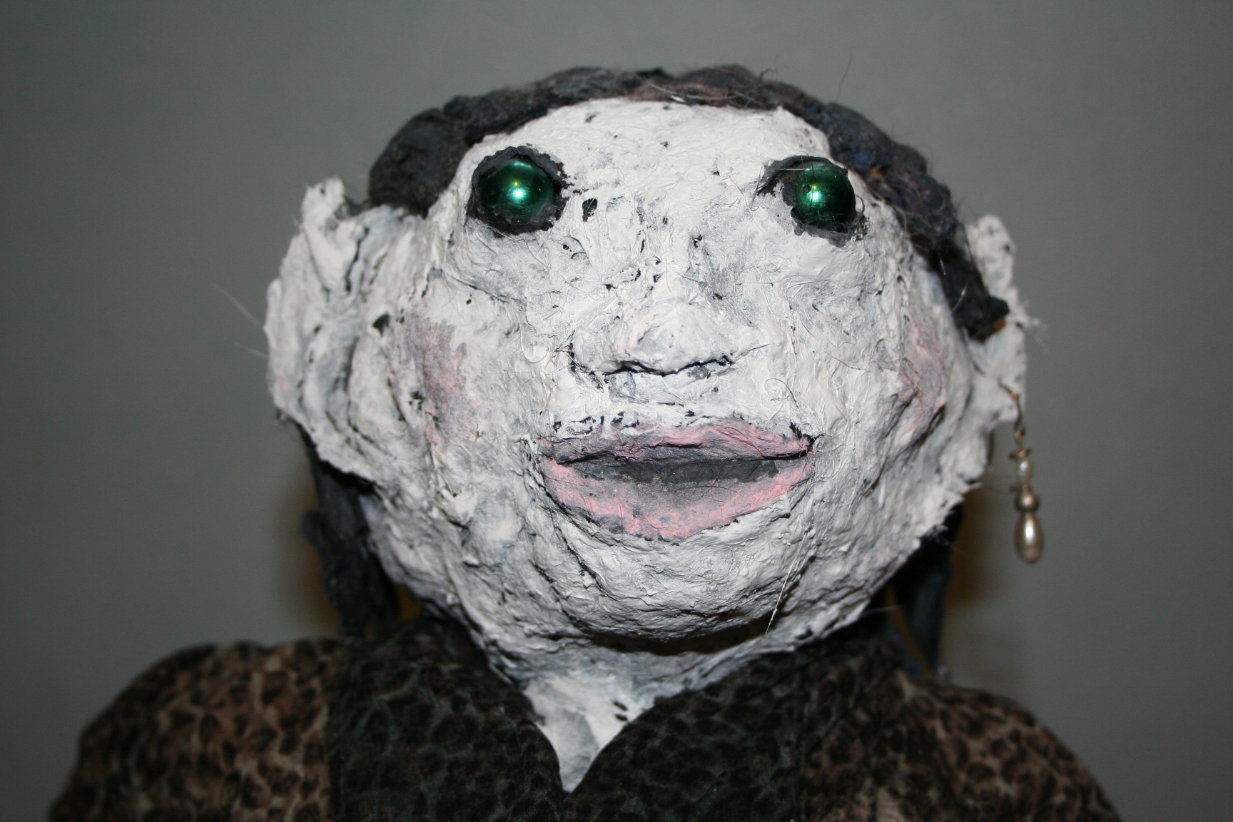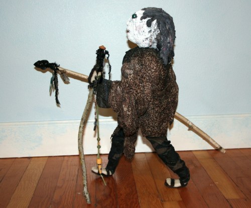 Her pants are the sleeves of an old camo pattern boy’s long underwear top. The blouse is what it is: a sheer animal print ladies’ blouse, cut to length. I used Alene’s Fabric Stiffener, so everything is “glued” down. The fabric stiffener gave a different color and texture to the fabrics, which is why I like it so much.