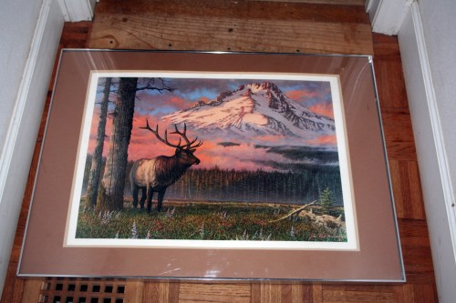 The only way I could get a photo of the lithograph without having a glare of reflection was to sit it on the floor in the hallway… So, yes, it’s a weird angle. The good news is that Michael’s had a 55% off custom framing coupon in the newspaper today. Oh wait, JoAnn’s had a 60% off coupon and Michael’s will honor that… so this is getting reframed ASAP with non-glare glass and a nice wooden frame. Paid $5 for it and found one online that just sold at auction for $50 – same lithograph series, but “nicely framed”. So I don’t consider that this is worth $50 (but it will be after I get it custom framed this week). It is titled “Mount Hood’s Reign” and is #315/1,000. It is also autographed down on the matte by the artist, John Paul Braman.