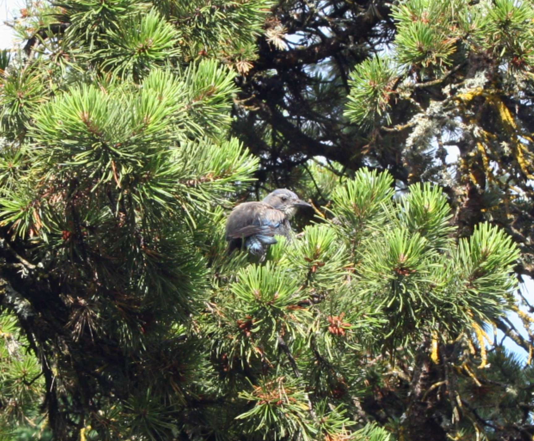 Meanwhile, I offer up to you this photo of a fledgling scrub jay that was sitting in the lodgepole pine outside our front window: