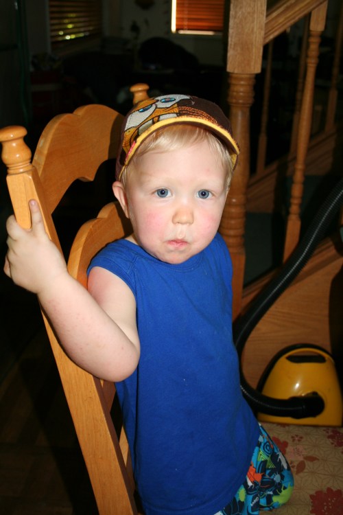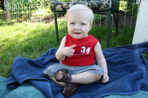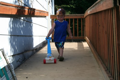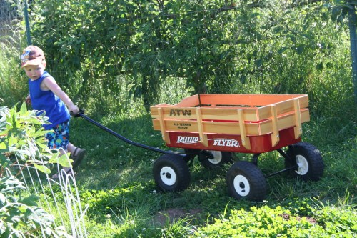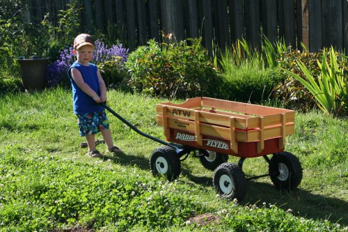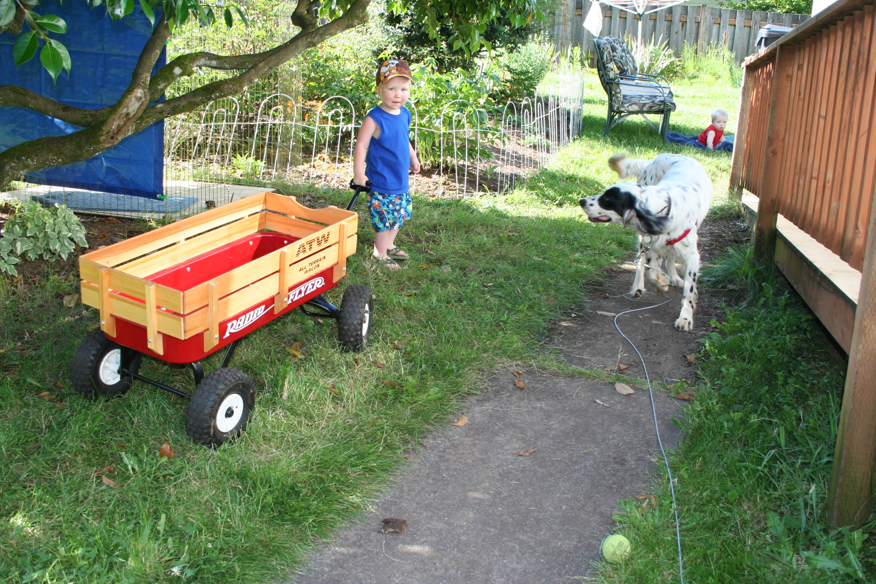 He wanted me to get the big red wagon out. I gave him one ride in it, but truthfully, it hurts my back to pull that thing around in our lumpy backyard. Eventually, Zephan decided he should pull the wagon around.
