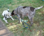 And fun it was. Don and I sat in the lawn chairs and just laughed at the antics as Harvey stole the rope toy time and again from Murphy. Tug of war? Harvey wins. Momentary lapse of attention? Harvey steals. Murphy stood over Harvey and barked and begged and feinted – but Harvey kept winning. When Murphy did get the toy, he trotted out of rope range and chewed on it. But he always took it back to tease Harvey, and Harvey would steal it away.