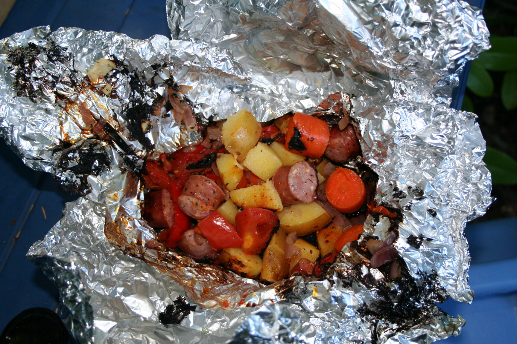 We chopped some turkey sausage, potatoes, carrots, red onion, red pepper and Roma tomato and put it on aluminum foil. Nope, nothing from our garden: it has been that lousy of a year for a garden!