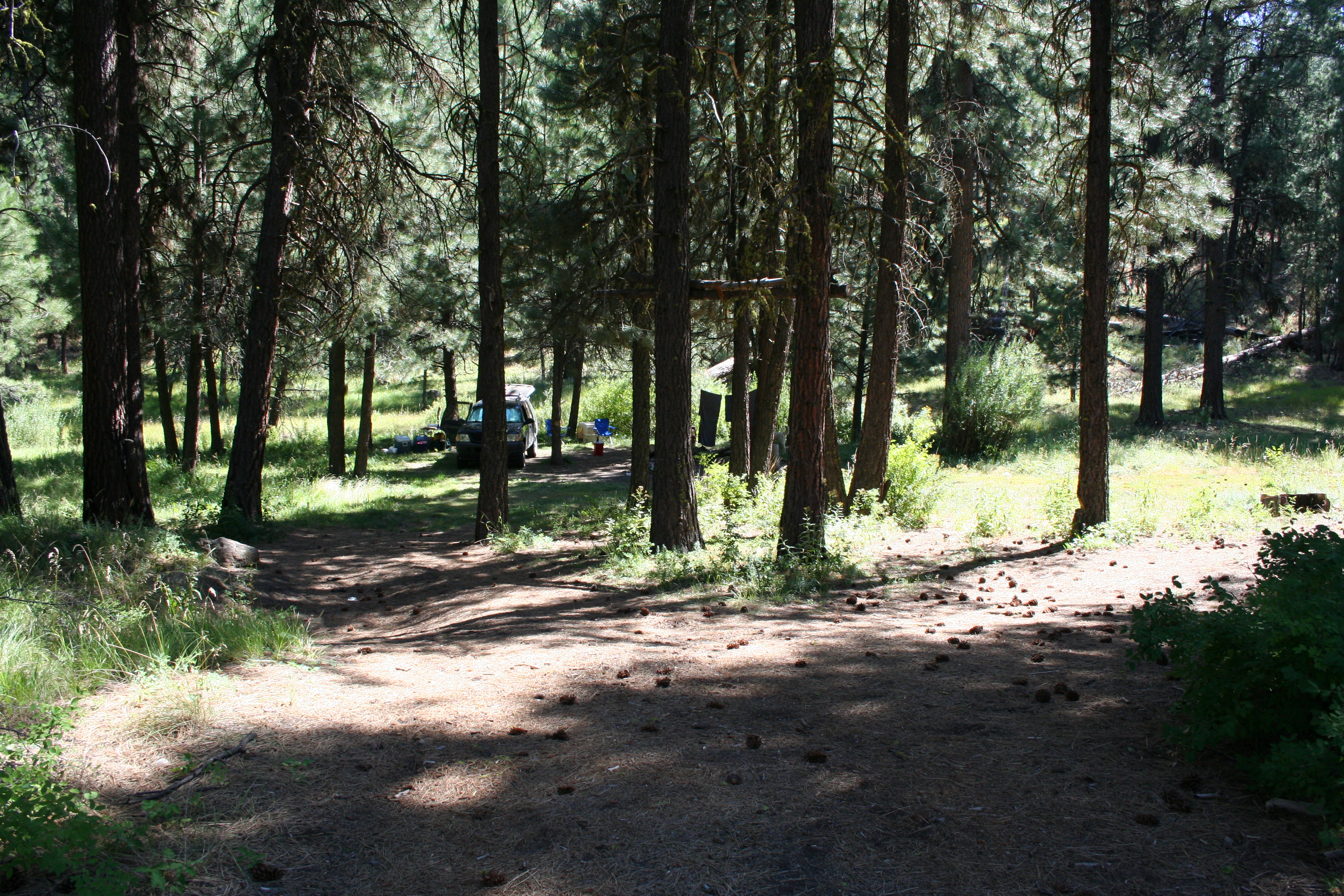Don had an idea that we could camp at a USFS designated campground but when we got to that site, it was full. And full was really not what we wanted with two big dogs that like to bark at other dogs and children on bicycles. So we back-tracked a little and took a chance on a spur road and found a beautiful site right on a creek.