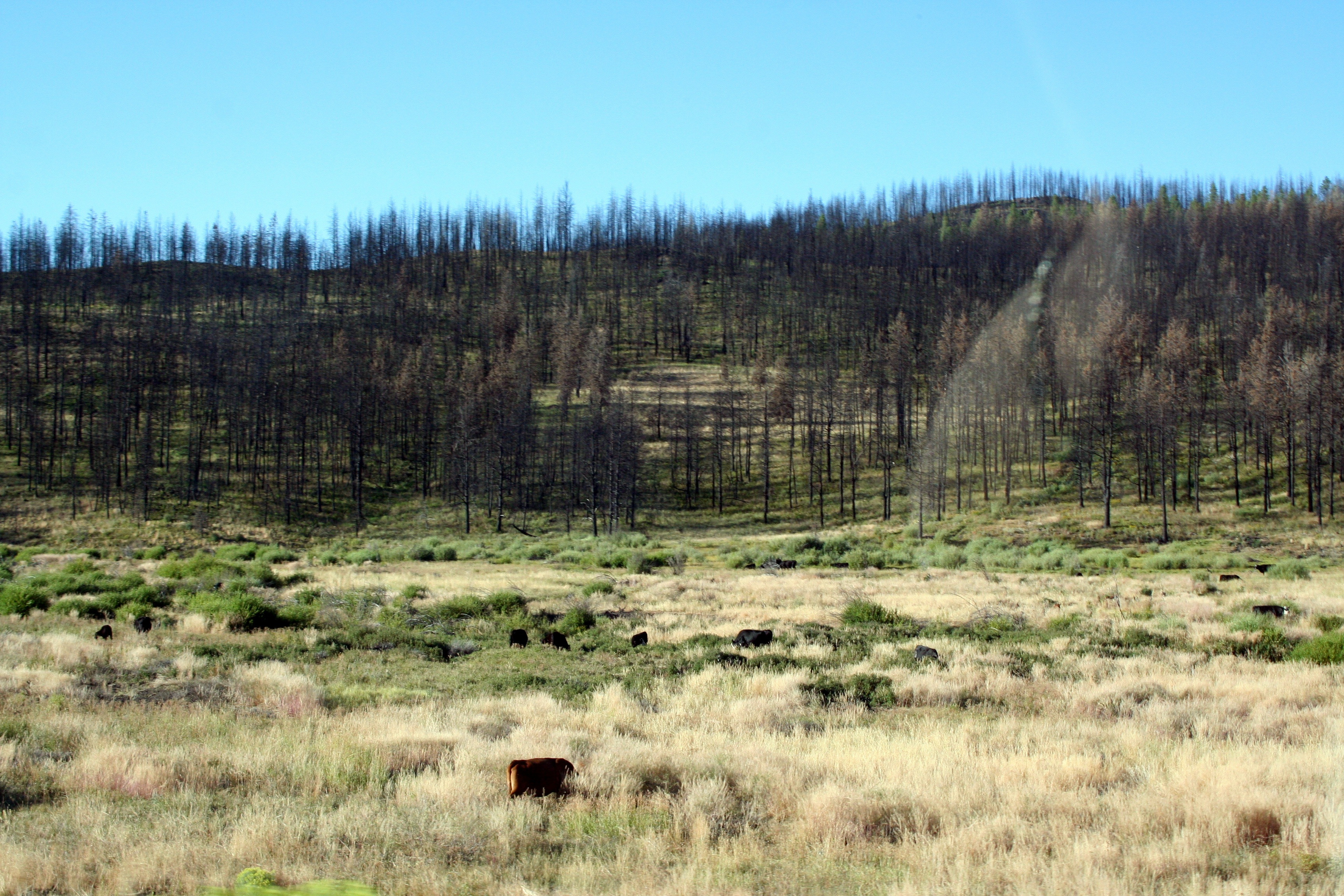 Yeah, it got cold. Good thing we pack our winter coats when we go on vacation to the desert in August: I wore mine all morning plus a pair of fleece gloves to keep my hands cold. No camp fire: fire danger was “Extreme” or “High” everywhere we went. And just around the corner from this camp was a grim reminder of why a camp fire in August is not such a great idea.