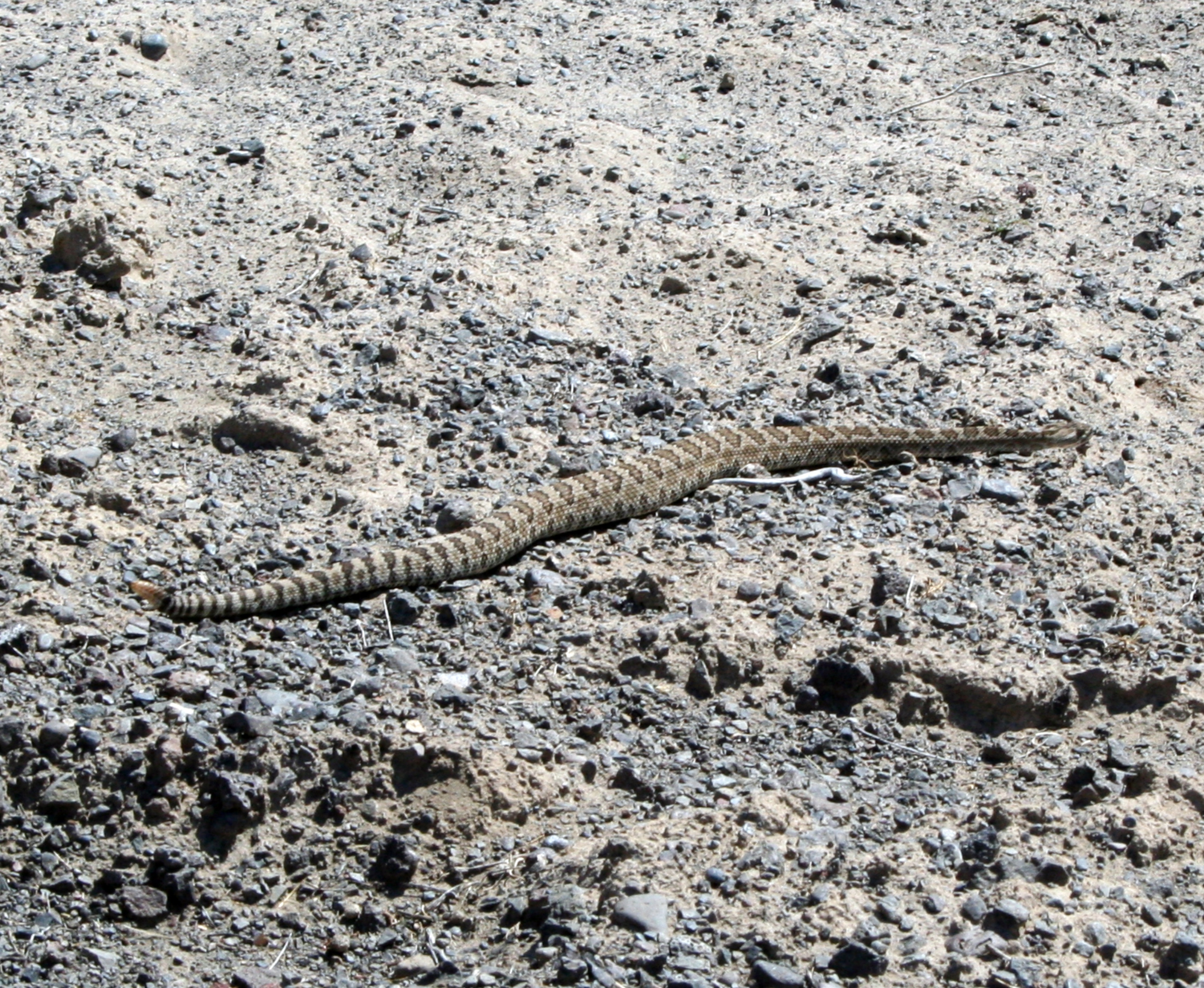 We try to avoid running over snakes. They could be bull snakes, for one thing, and who wants to kill a bull snake? Or they could be a racer or something else “benign”. But most often they are exactly what we found: a Great Basin rattlesnake. A fat one, too, full of some poor golden-mantle groundsquirrel dinner and making for the sagebrush as quickly as it could.