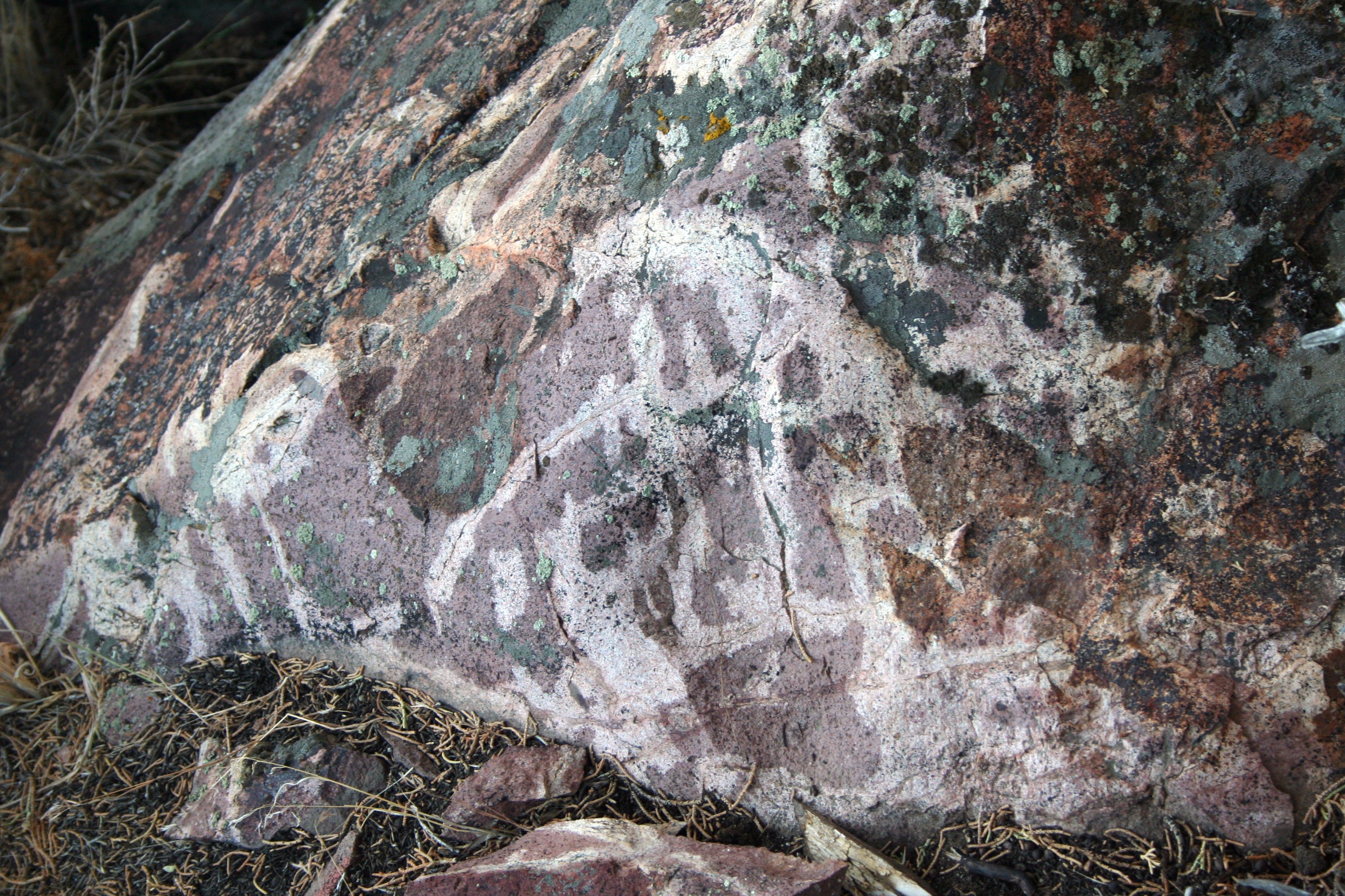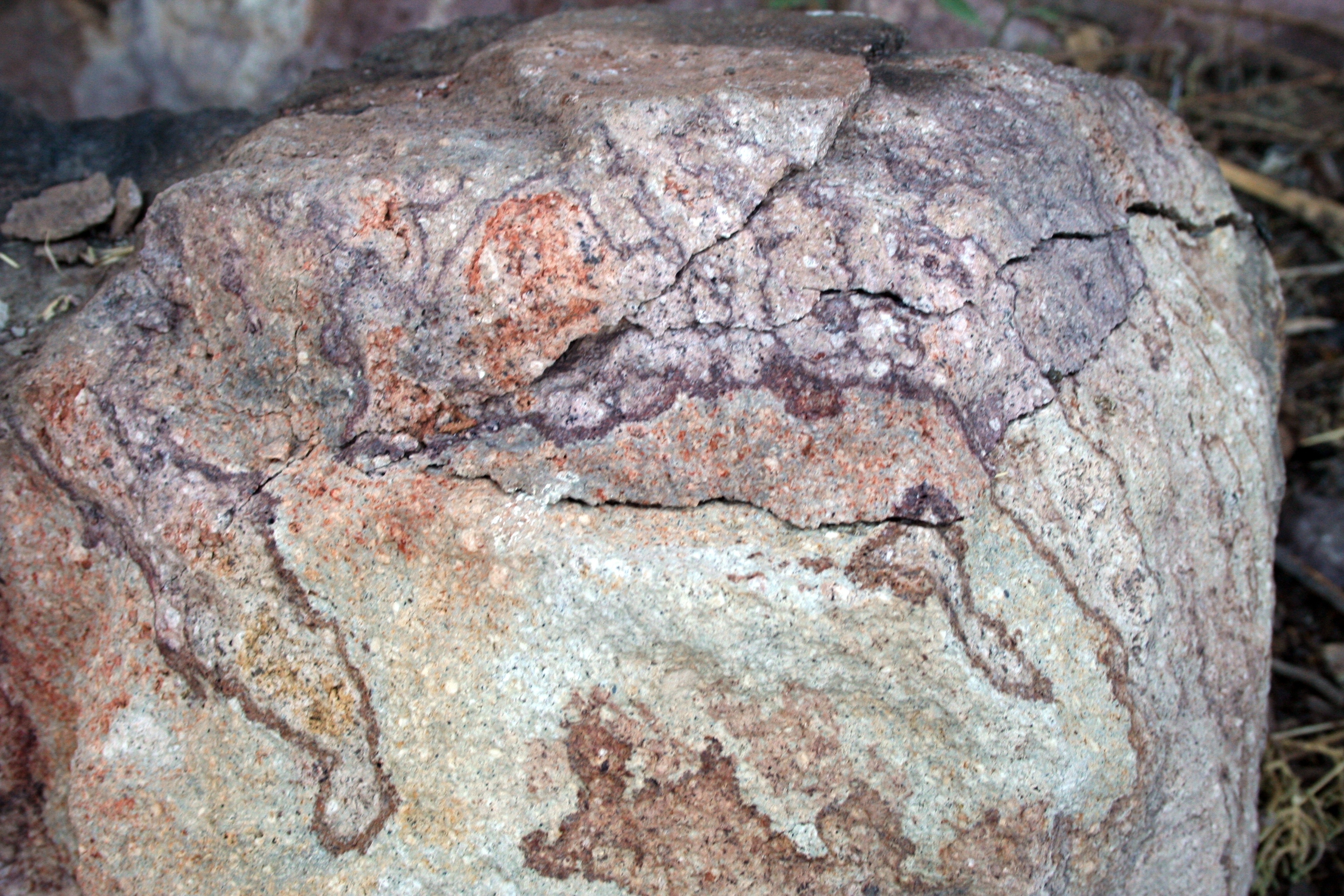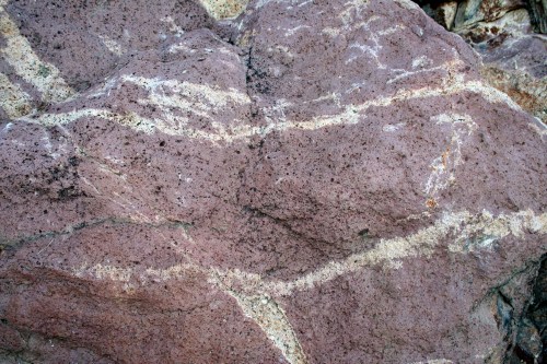 The pattern of white rock in the pink rock looks like some sort of ancient graffiti, but it isn’t: it’s a natural streaking.