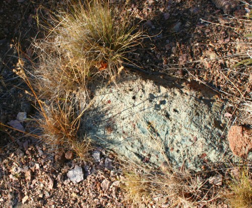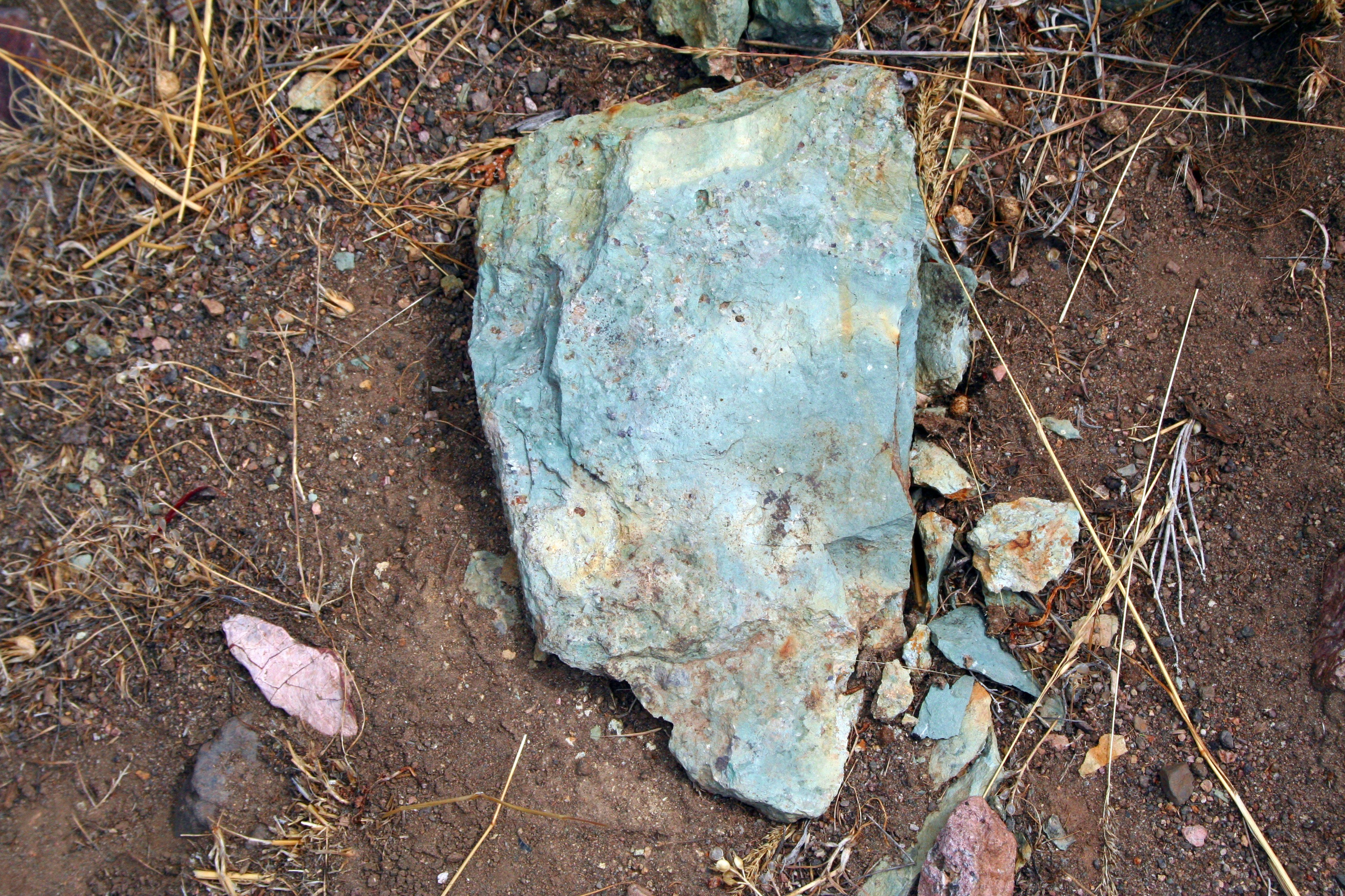 Down on the private property section of the creek, the boulders are house size and made up of some pink-and-white sedimentary composition. There are green rocks, too: startling green rocks.