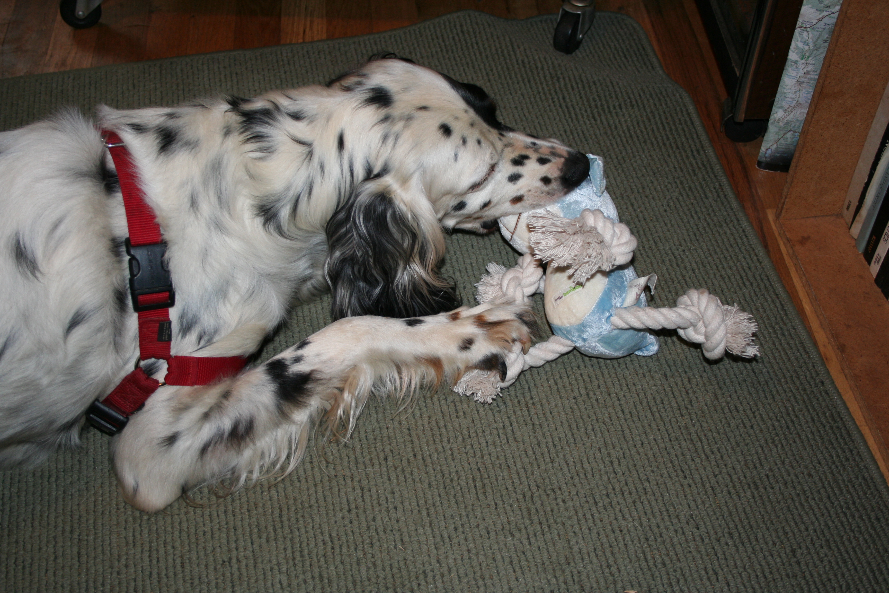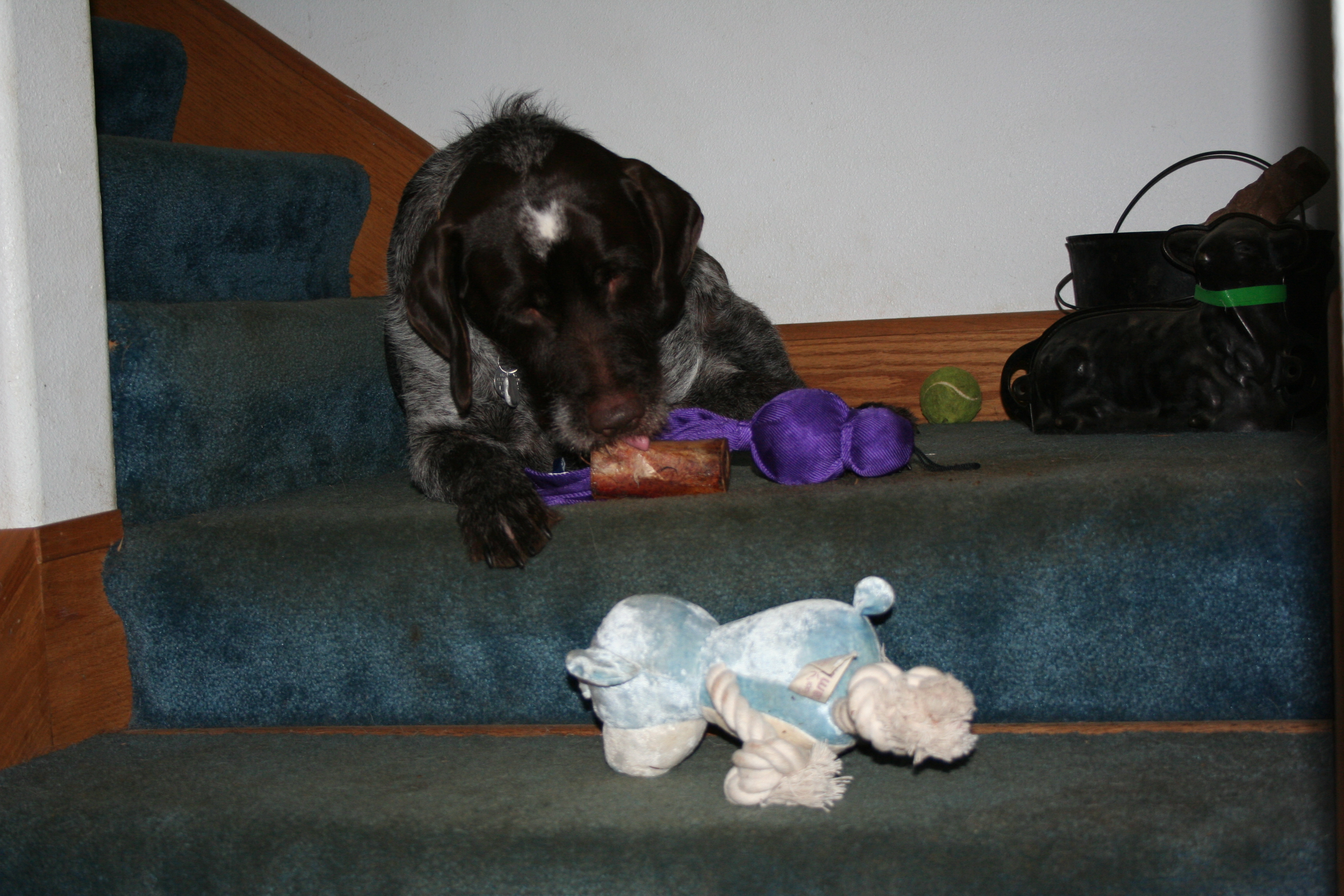Murphy immediately stole all the toys and cached them on the stairs.