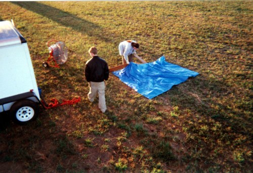 Looking down from the balloon as Levi and friend Mary clean up the launch site of Miray’s hot air balloon.