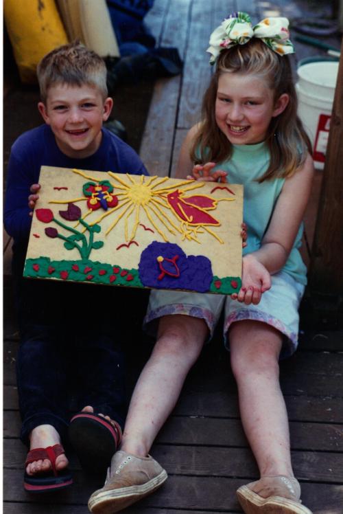 Cheesy grins. Camping gear packed in the background. I always thought of this photo as a homeschooling photo but it was in the public school photo album. I honestly cannot remember why I asked the kids to make a clay picture. But who cares? It’s great! Just like the cheesy grins.