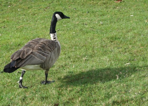 Normally the geese are rather boring. They goose-step, poop, sidle away, stop traffic and so on, but for taking photos: they’re boring. Except for his (her?) ID tags, old XW46 is boring. XW46 has been around for a couple winters now.