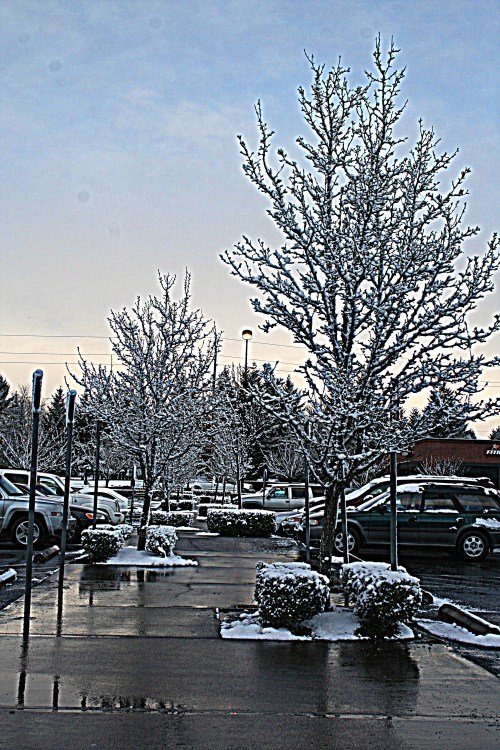In the afternoon, I left an office where there was hardly any snow and drove home to a winter wonderland. Fresh snow clung to all the trees and grass, but not the sidewalks.