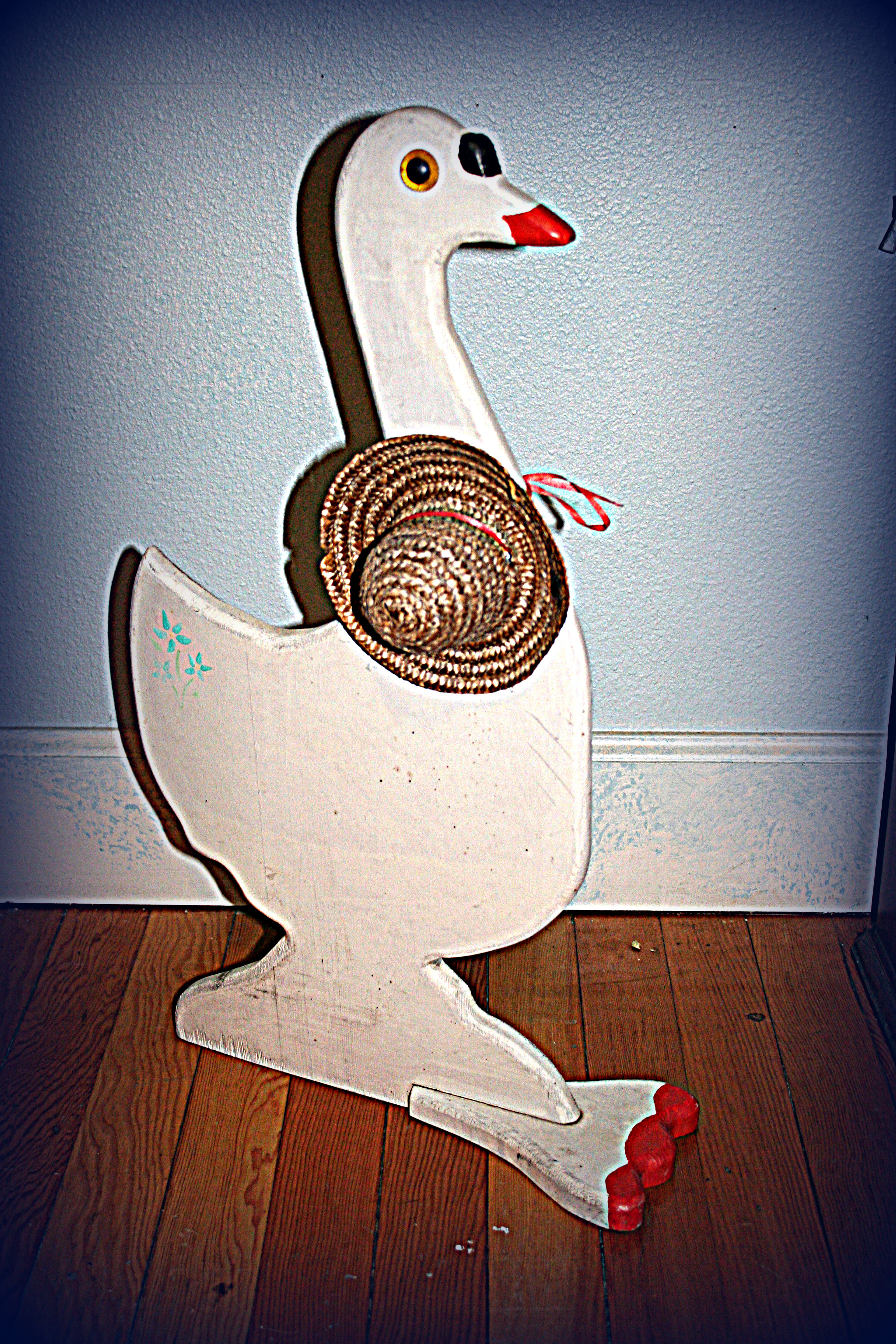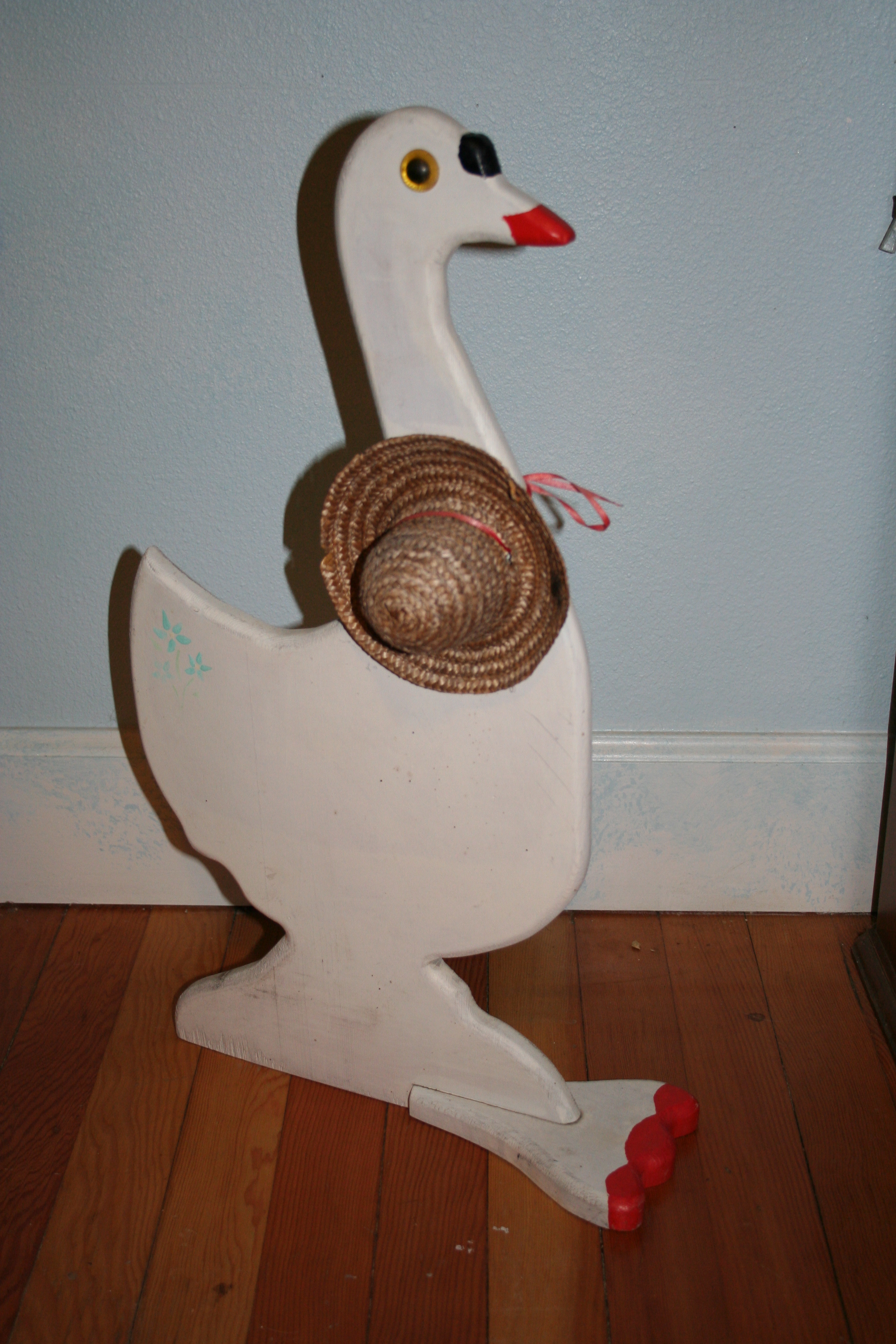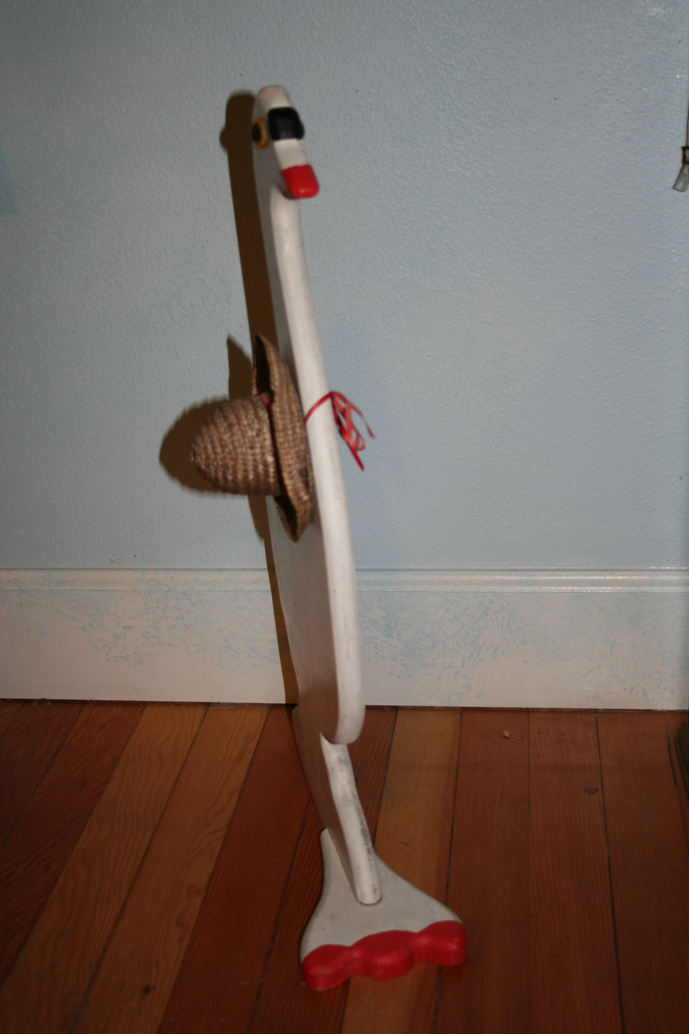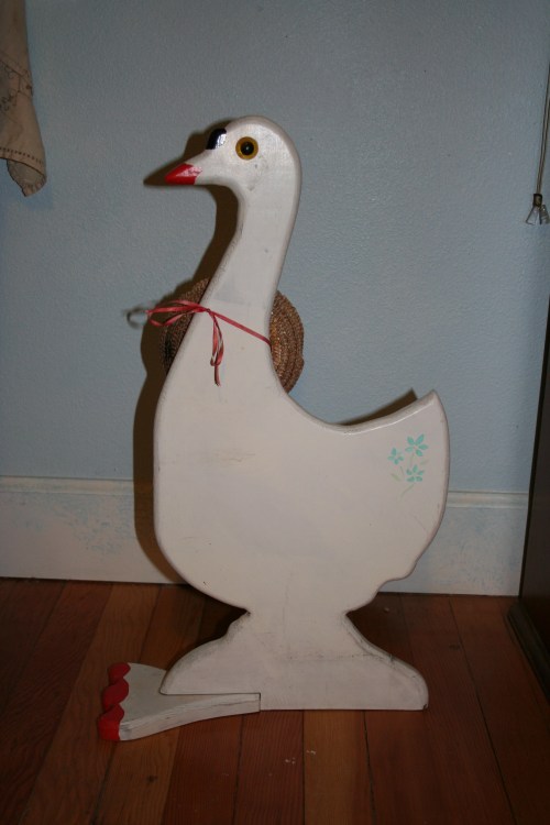 The basic bones of the goose are good. She’s 23″ (58.4cm) tall and made out of 1″ (2.5cm) thick plywood. Not chipboard: plywood. She’s solid. Her feet (foot?) is screwed on with two screws. Her eyes are perfectly lined up.