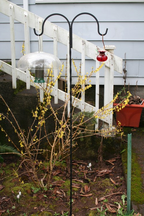 I decided to put out more bird feeders today as well. I filled the goldfinch feeder with Nyger thistle and filled two hummingbird feeders. The weather is starting to warm up and I hope to attract some colorful little birds to the yard. Did you notice the forsythia is opening up?