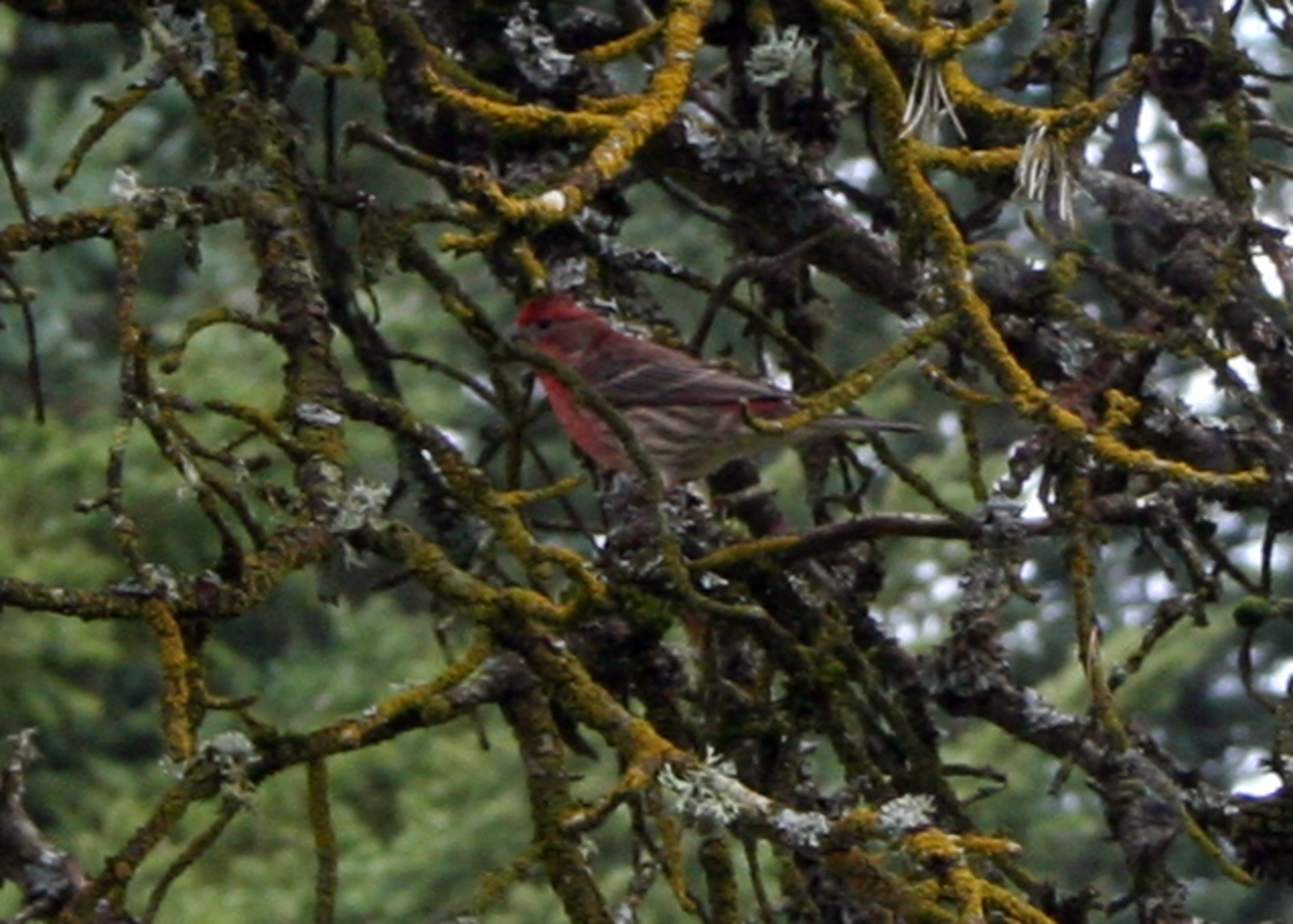 This male House Finch was dueling one of the English House Sparrows for a spot on the feeder. The finch eventually won (they are both finches, technically: the English House Sparrow is a Weaver Finch).