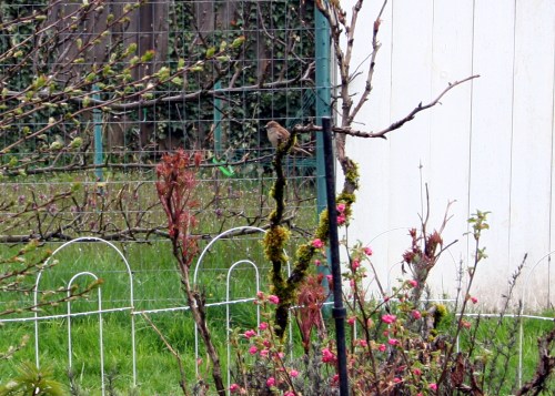 The English House Sparrows have made themselves at home in Don’s over-grown Hawthorne. But do you think they’d hold still when I appear with a camera? I caught this one on one of my tree peonies just about to take flight.
