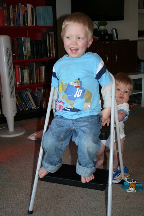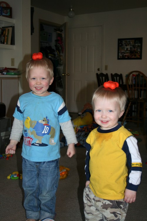 Mom-mom visited her little blond grandboys today. She learned all kinds of interesting things about “Bawb Bawbub” (I’m told that means “Bob the Builder”). She met the new lizard, a Chinese Water Dragon named “Starbucks”. (Do you have to add the ™ when you name a pet with a Trademark?) She fielded a dozen inquiries about where “Buppy” was (home, in his kennel, where he belongs).
