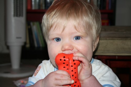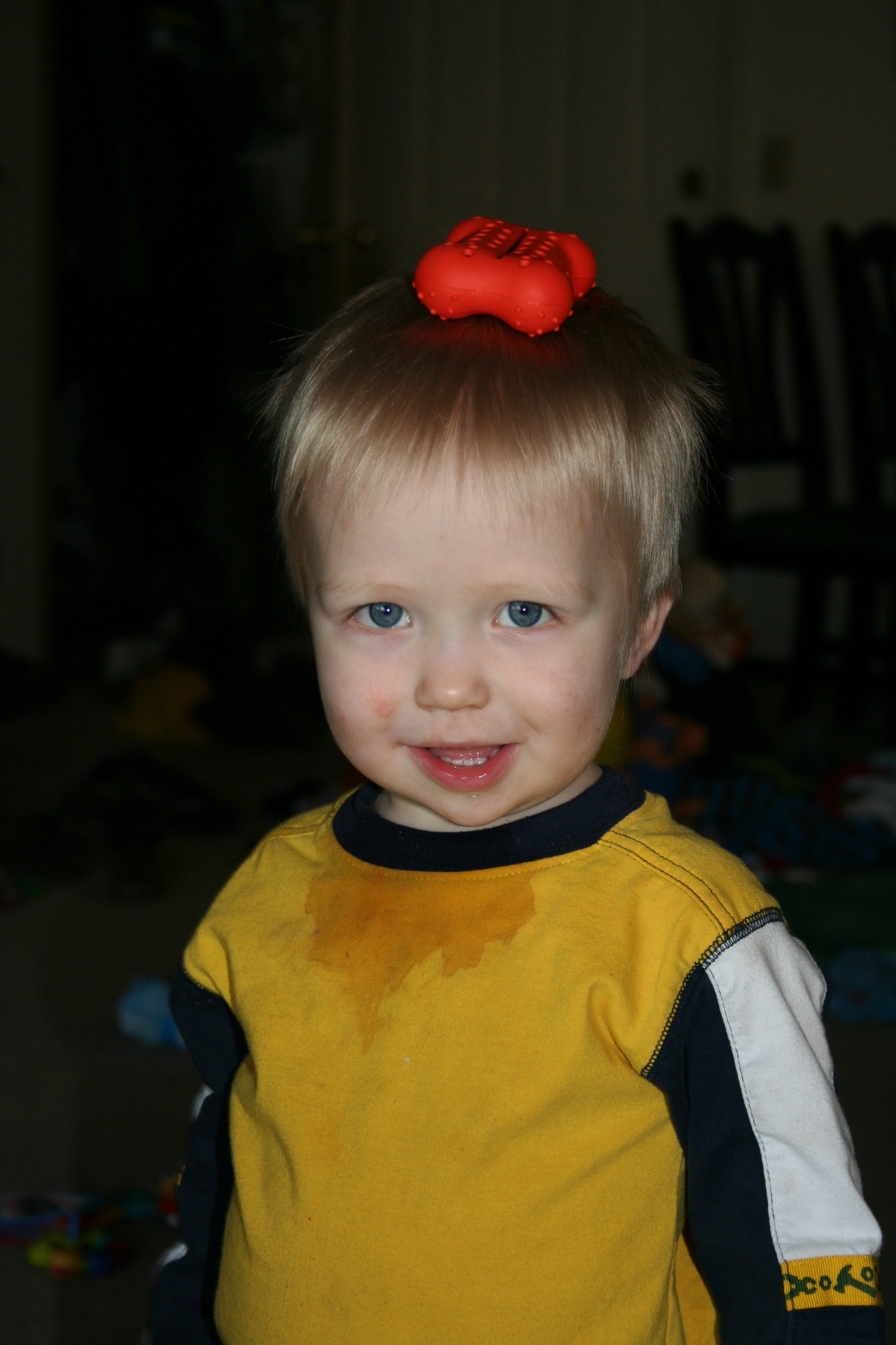 Which brings me to a question: what do you do with two orange rubbery dog-biscuit holders when your dogs are more likely to chew them up than wait to appreciate the imaginary treats inside? Why, give them to your grandsons to use as coin or “treasure” purses, of course. Or teething toys.