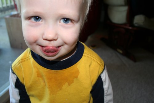 Harpo is silently praising himself for the tongue-sticking-out strategy. Smile, Mom-mom!