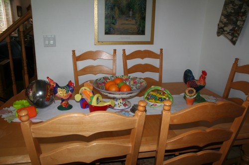 Gamma eagerly awaits the arrival of the closest grandsons with a table laden with gifts. OK, most of it isn’t gifts – I’m not parting with my ceramic chickens and the kids couldn’t have any of the candy and no one was very interested in the fruit bowl, but… The little watering cans with garden tools and the big rubber ball were just waiting for grandsons.