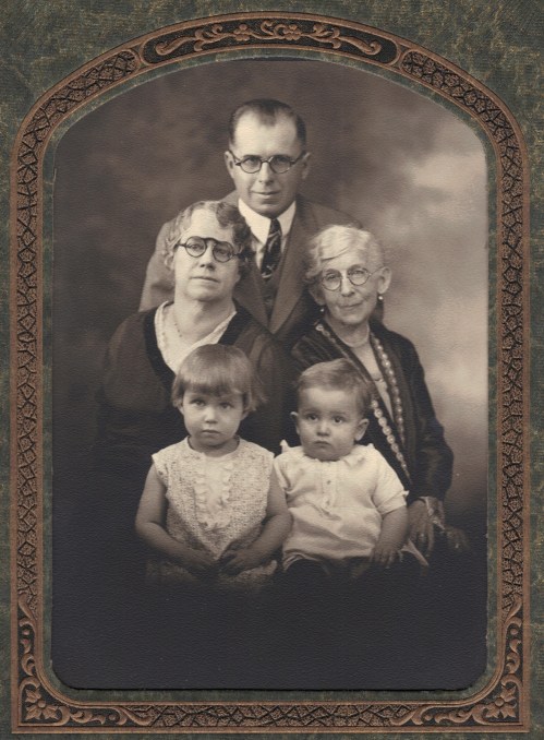 Gramps (“Fritz”) with his wife (Sylvia) and his mother (Irene Kimmey Wilcox). Mary & Jack in the foreground. Probably 1929.