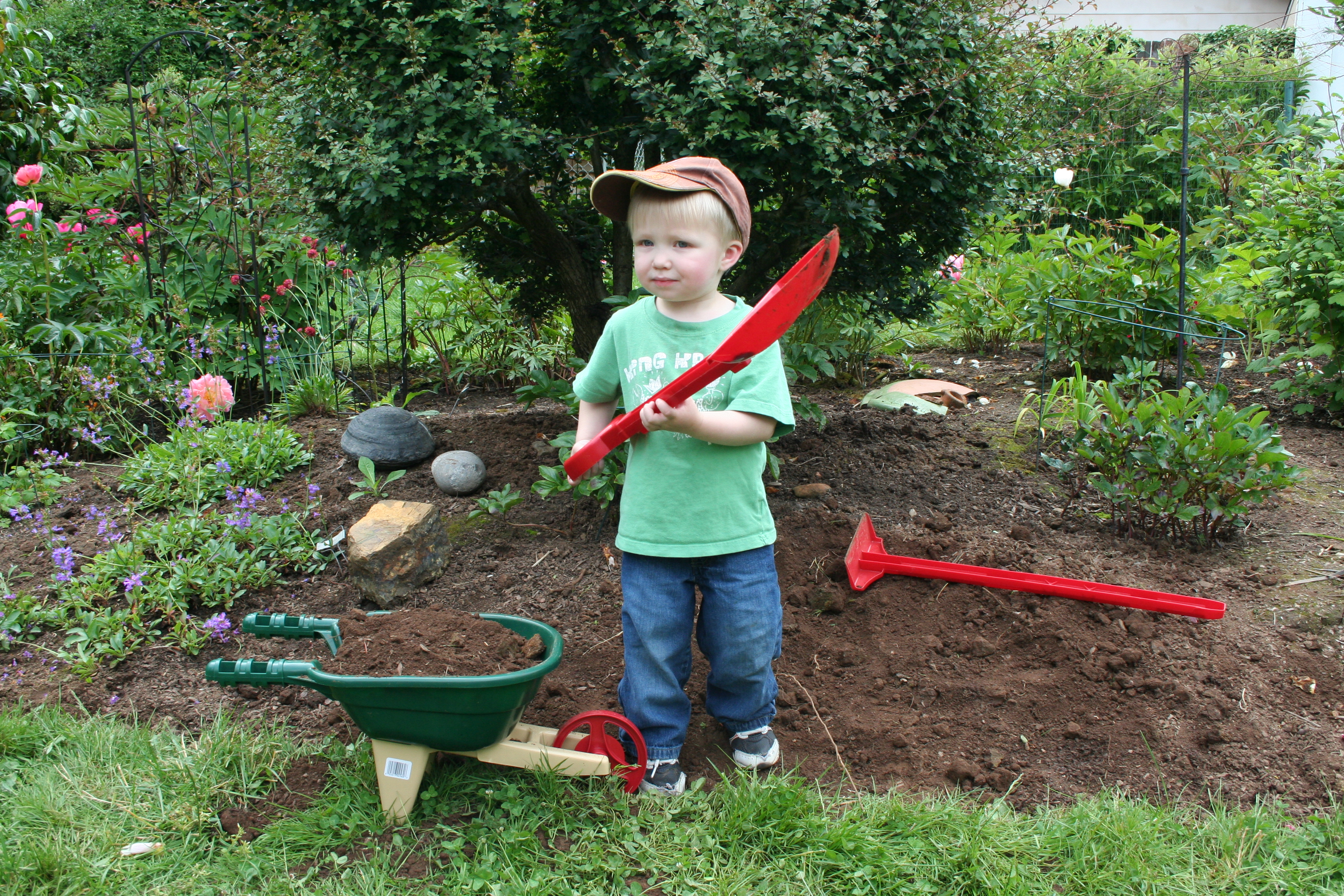 At Grandma’s House, Javan got a plastic shovel-hoe-rake set that was nearly identical to Zephan’s 2nd birthday present from Grandma & Poppa. No need to worry about labeling: Zephan memorized the color coding immediately. Z’s shovel is green, the rake red and the hoe blue. Javan’s are red, blue and red.