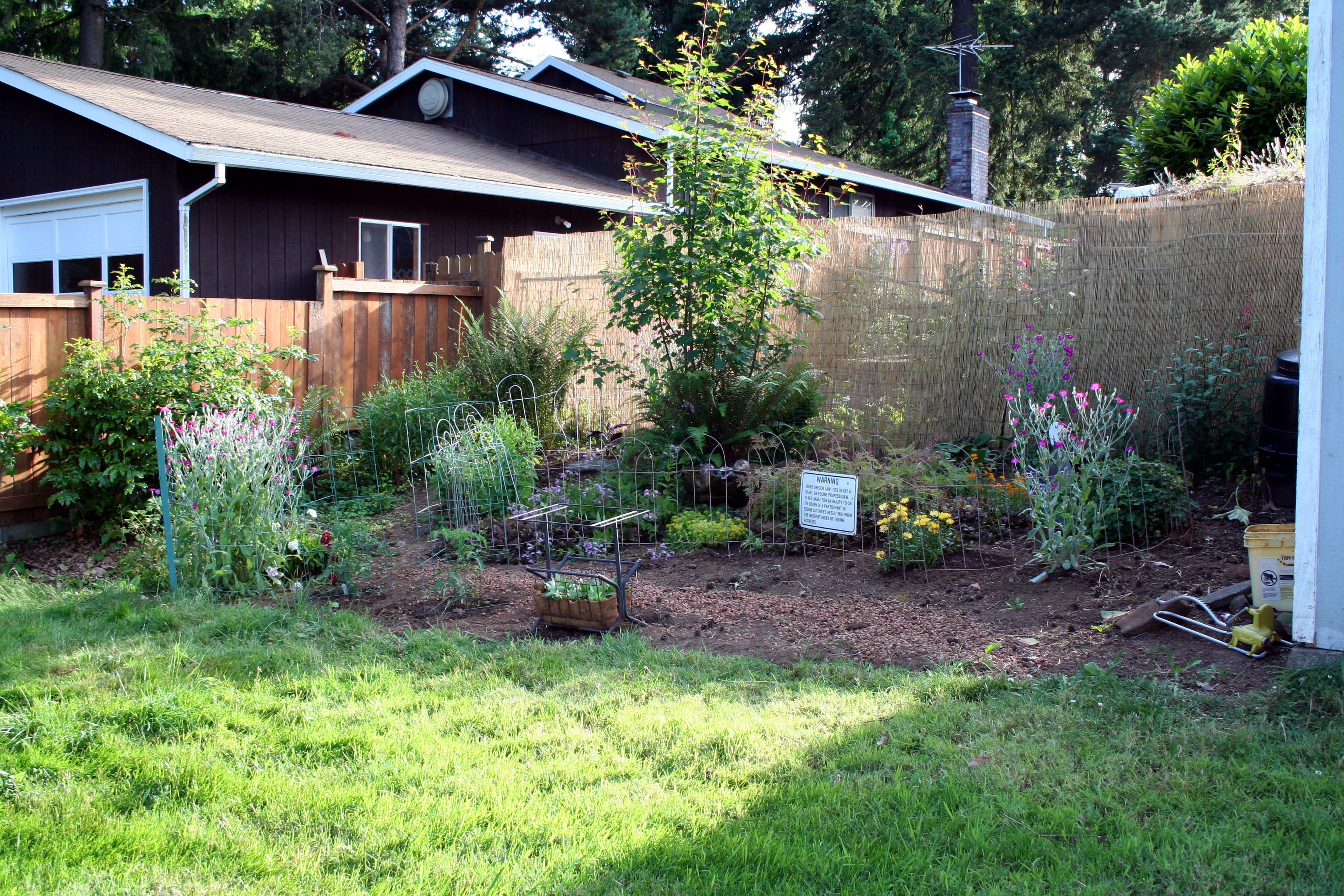 Those are my pitiful tomato plants in the front. I think I have a blossom starting to open on one. It’s only the 3rd of July, what the heck. If we have hot weather through October, I might even get a ripe tomato.