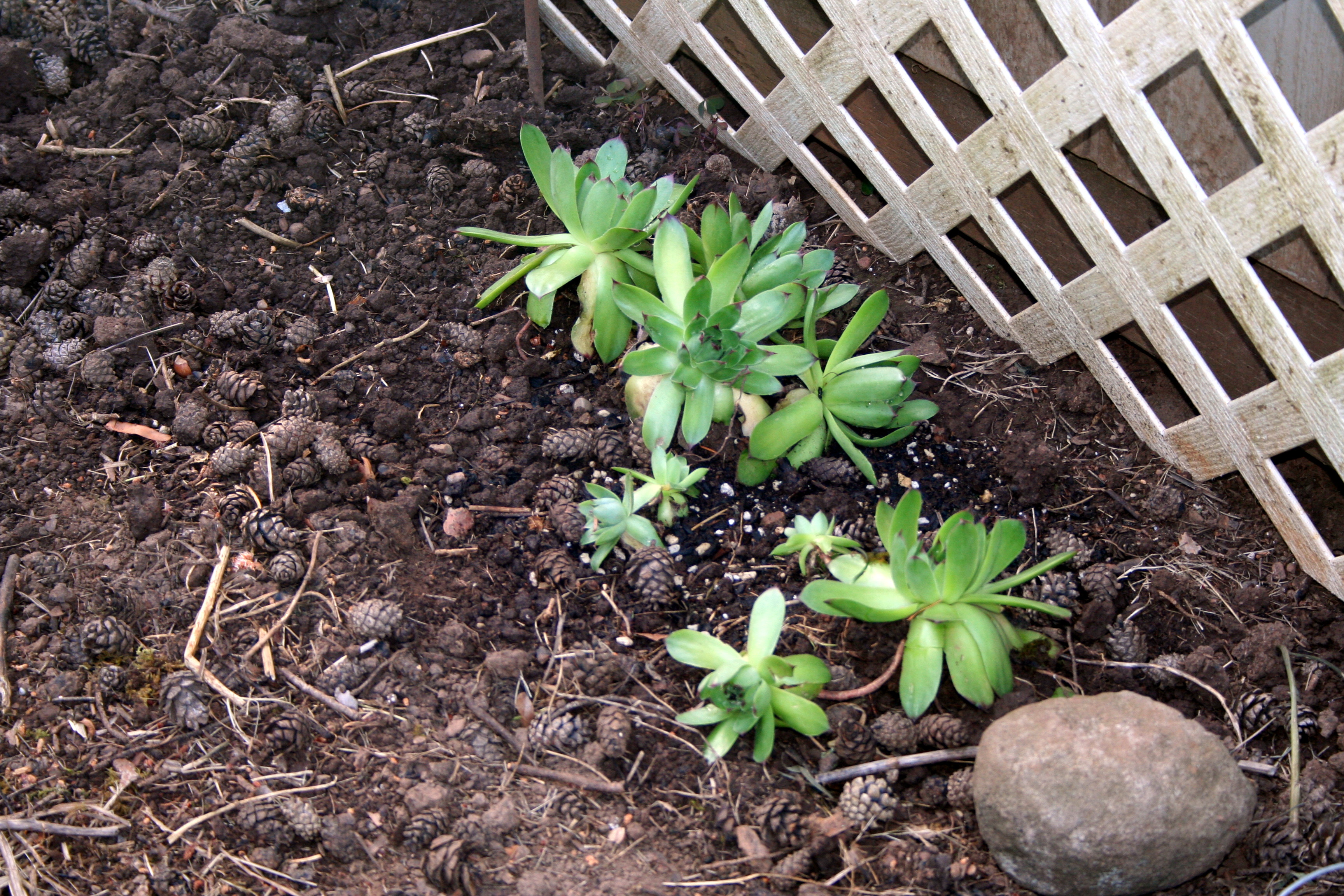 Left over hens and chicks were transplanted to the dry side of the garden where all the neighbor’s pine cones fall. They should survive. I think I’ll plant a number of sedums in that area over the next few weeks. Great drainage.
