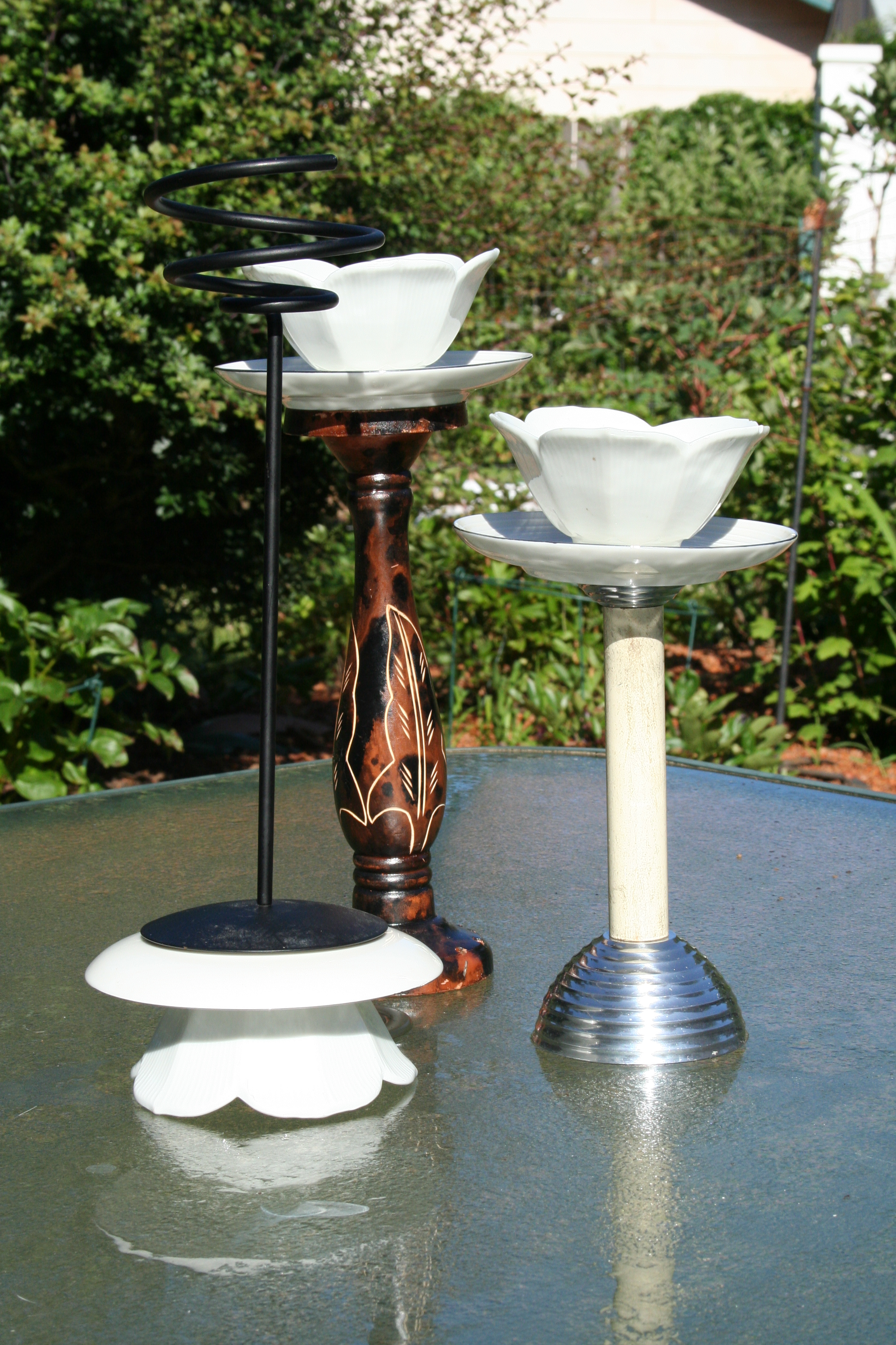 In the case of the glass “bell” flowers, only one day was necessary to “set” everything. The tea cup flowers took two days because I had to glue the cups to the saucer and then glue that to the the “stem” (once I knew the first glue would hold). I still plan on painting the glass bell flowers and maybe – just maybe – I will embellish the tea cup flowers.