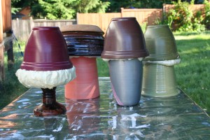 The mushrooms proved a tad bit more difficult. For one thing, I wanted to fill in the space between the cap & the stem to prevent slugs and other creatures from using that space as a home. And one “stem” needed ballast.