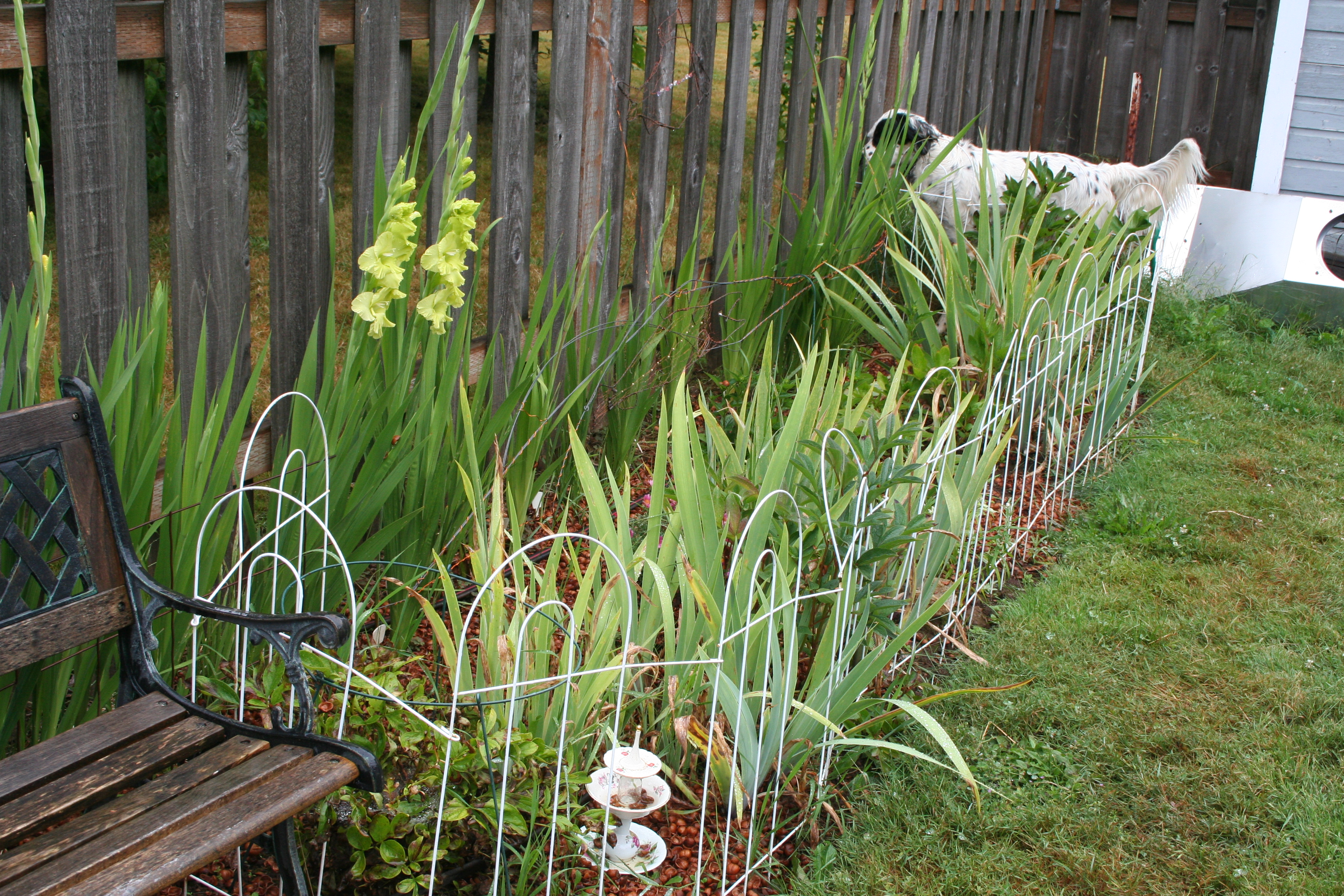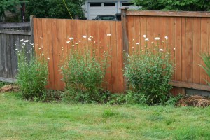 Eventually the rest of my little picket fences will go around my Shasta daisies. I can see the flower bed needs weeding again. Never-ending job. The cool weather and rain is only encouraging the weeds to grow.