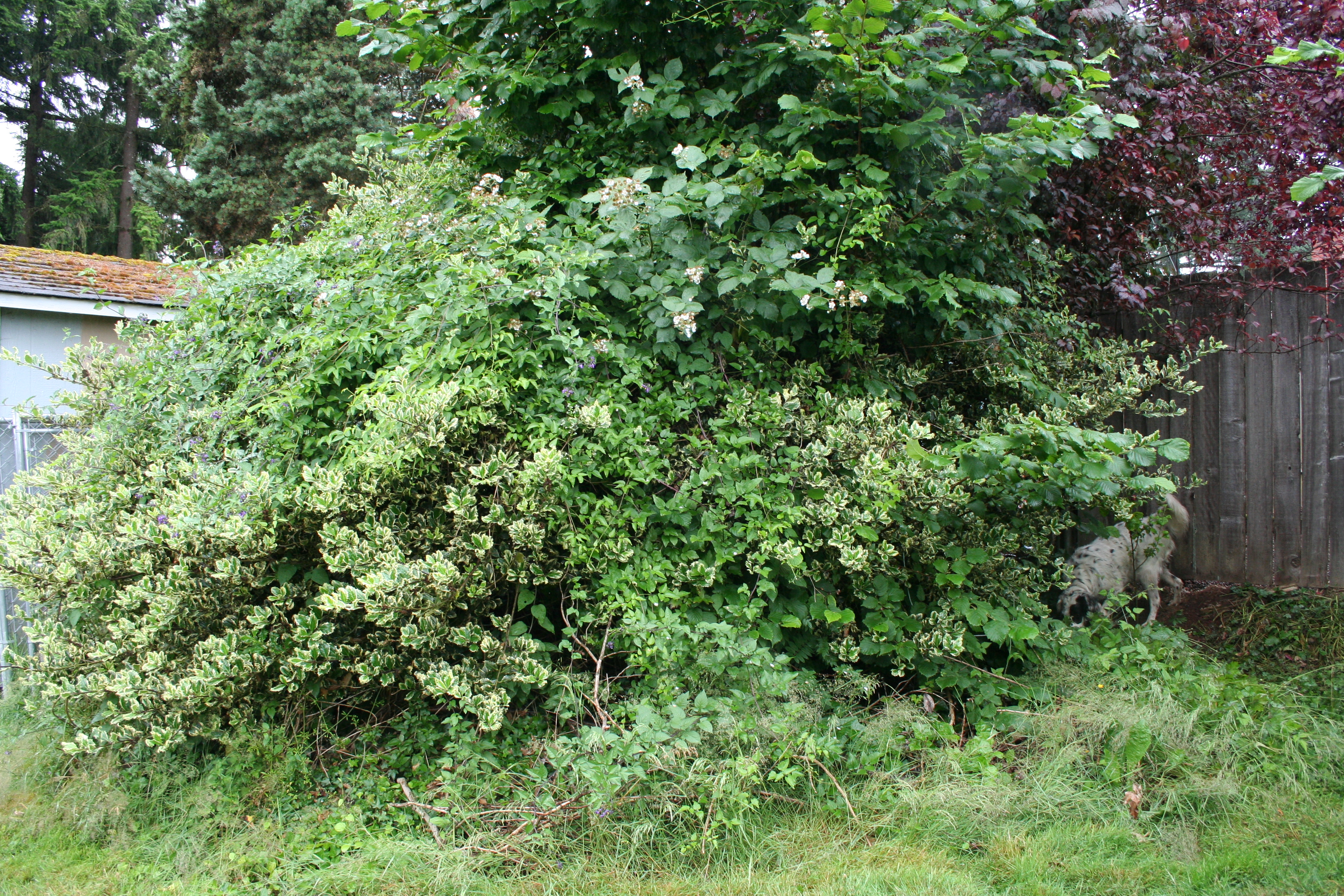Also speaking of forests, there’s this in my yard. It’s a forest of it’s own: a mess of a male variegated holly tree that someone topped years ago. Grown up under and through the holly’s canopy are a couple wild hazelnuts, a tangle of Himalayan blackberries and an infusion of nightshade on the vine. It’s an eyesore.