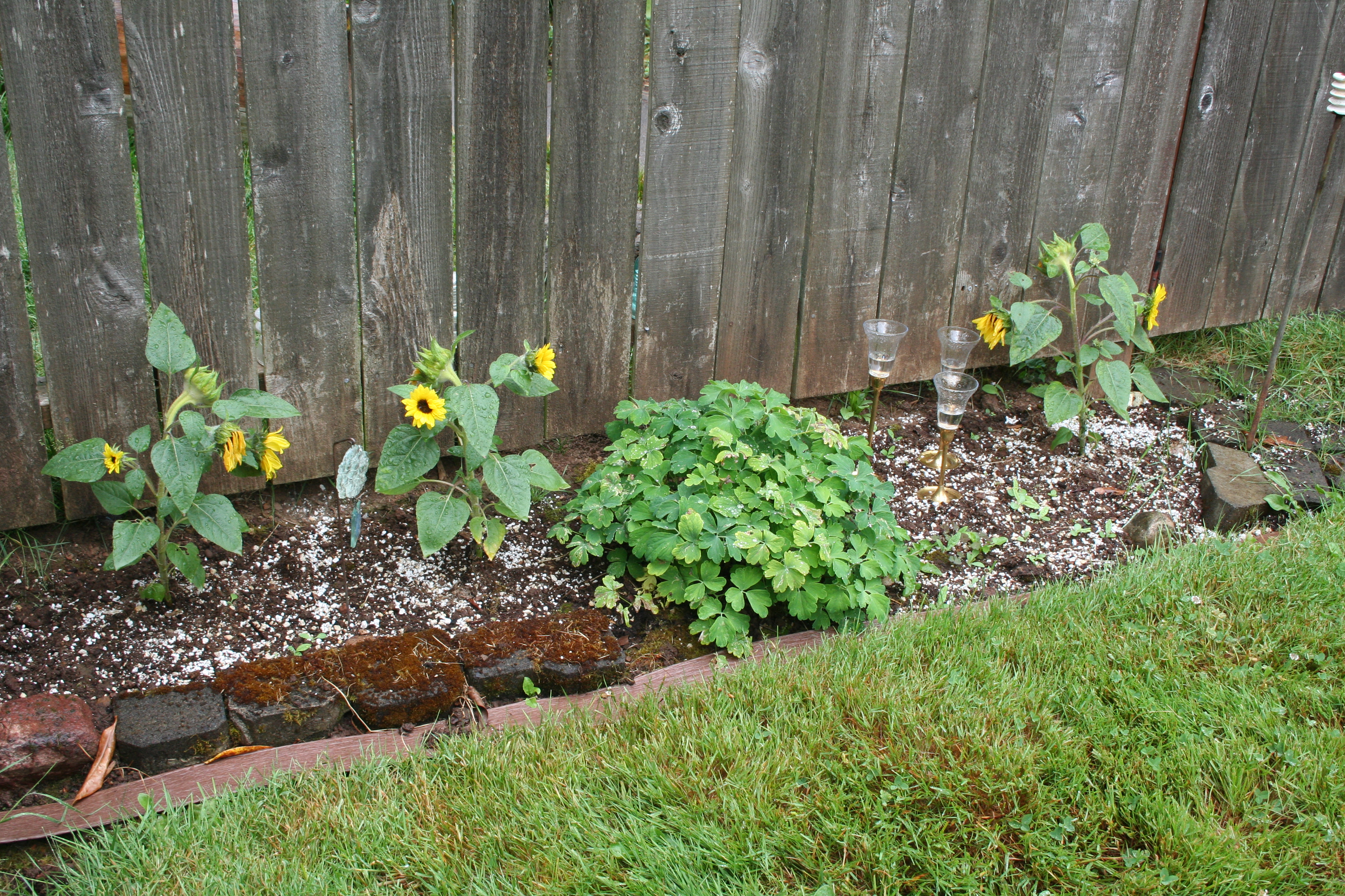 I planted the sunflowers out front. Usually I have giant sunflowers planted out there but this year I just didn’t get any seed into the ground in time. But the little sunflowers work well with the garden art so I can’t complain. At least not too much.