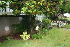 Oh look! Raindrops on the camera lens! This is the dark pink rhodie under which I have a hosta, some honesty plants (now past), some lilies and the forsythia. There’s some foxglove back in there, too, but I am afraid it is year one for that pretty biennial. I lost the established foxgloves last winter. It’s sure weird what plants you lose and what manage to make it through the winter.