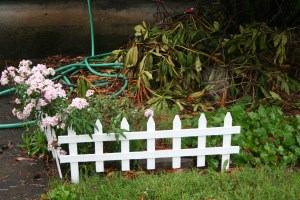 The side closest to the front door with my store-bought picket fence. The Dianthus (Sweet Williams) are all falling over themselves in an attempt to escape the rhodie.