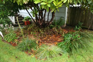 I have bear grass under this rhodie, some wild licorice ferns, bunchberries that need to be moved to a better location (they don’t like the rhododendron and the constant layer of fallen leaves, and fringe cups all growing under this bush – all native plants I have gathered and transplanted (with a permit, of course). Nothing grows right under the rhododendrons except the native “Boston” -type ferns. Even the licorice ferns appear to be trying to escape the alkali soil and lack of sunlight…
