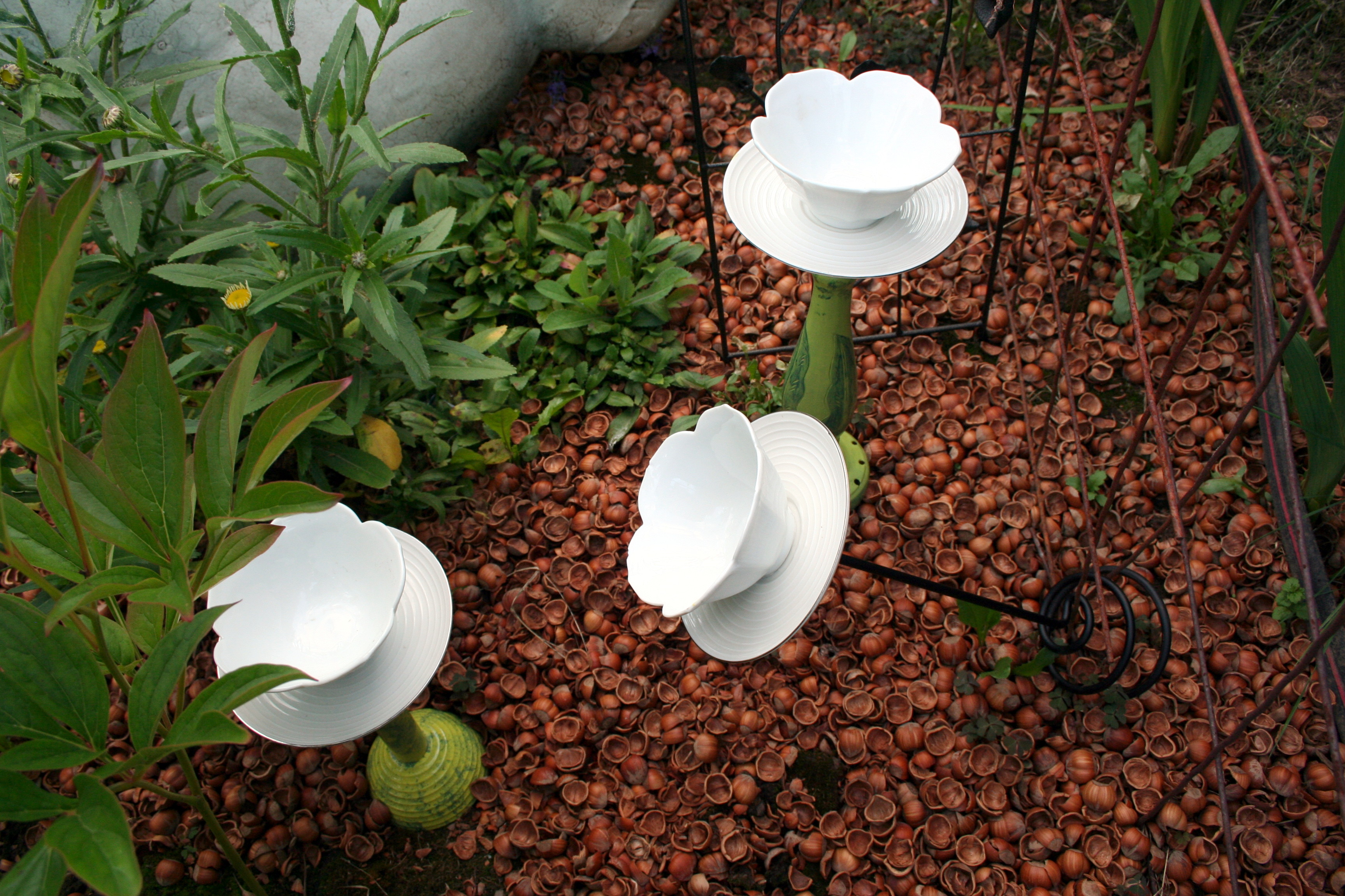 Willy Wonka tea cup flowers! They aren’t yellow daffodils but they were such a perfect find at Goodwill! Three little flower-shaped white porcelain cups, 3 saucers (from Pier One according to the label on the bottom) and three funky and very different stems. These are my favorites. Of course all yard art will have to come in when winter sets in but how fun to have a bit of whimsy in the garden!