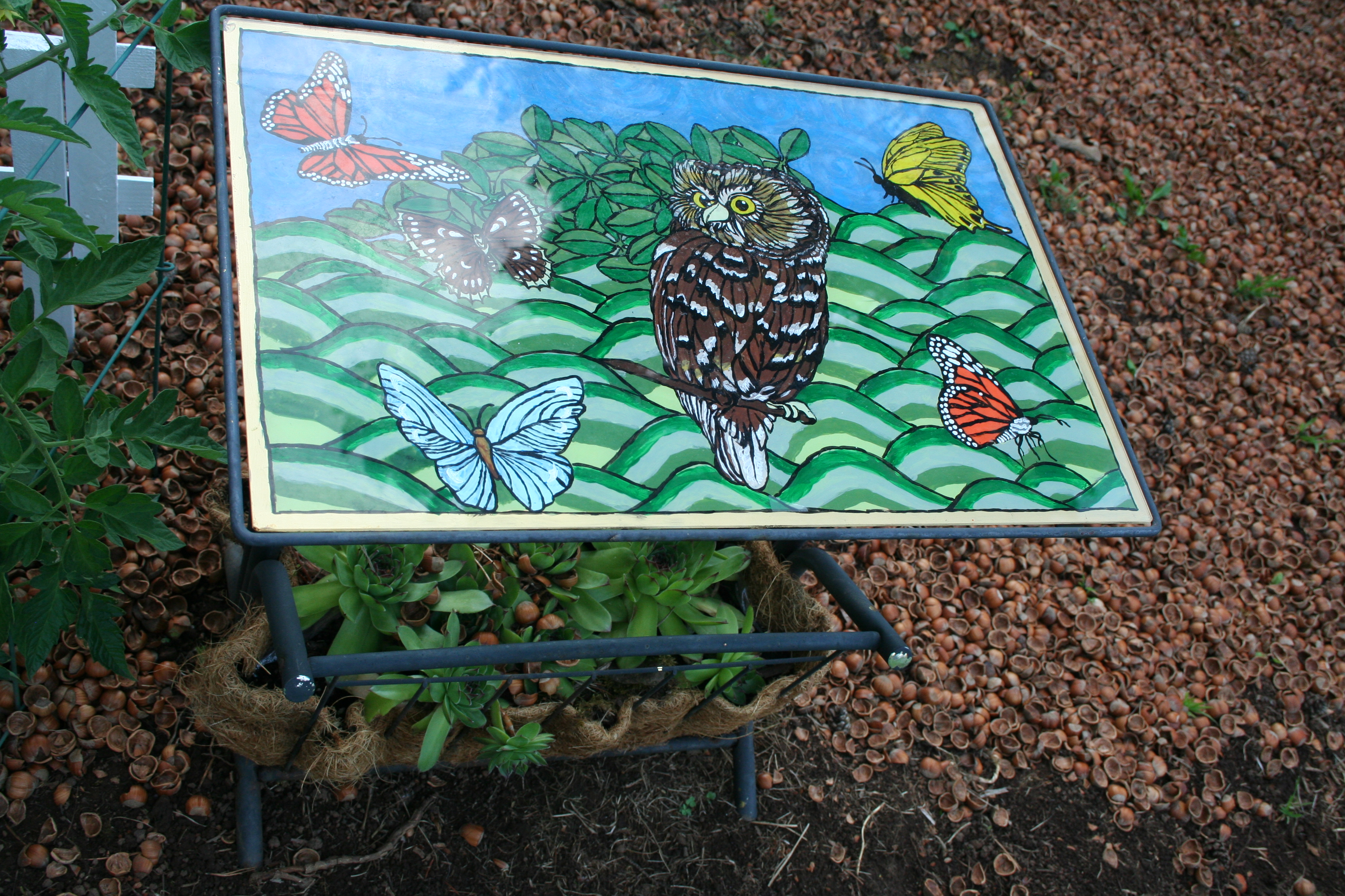 Since then I have added the hens and chicks and the new painting on the glass top. I love it.