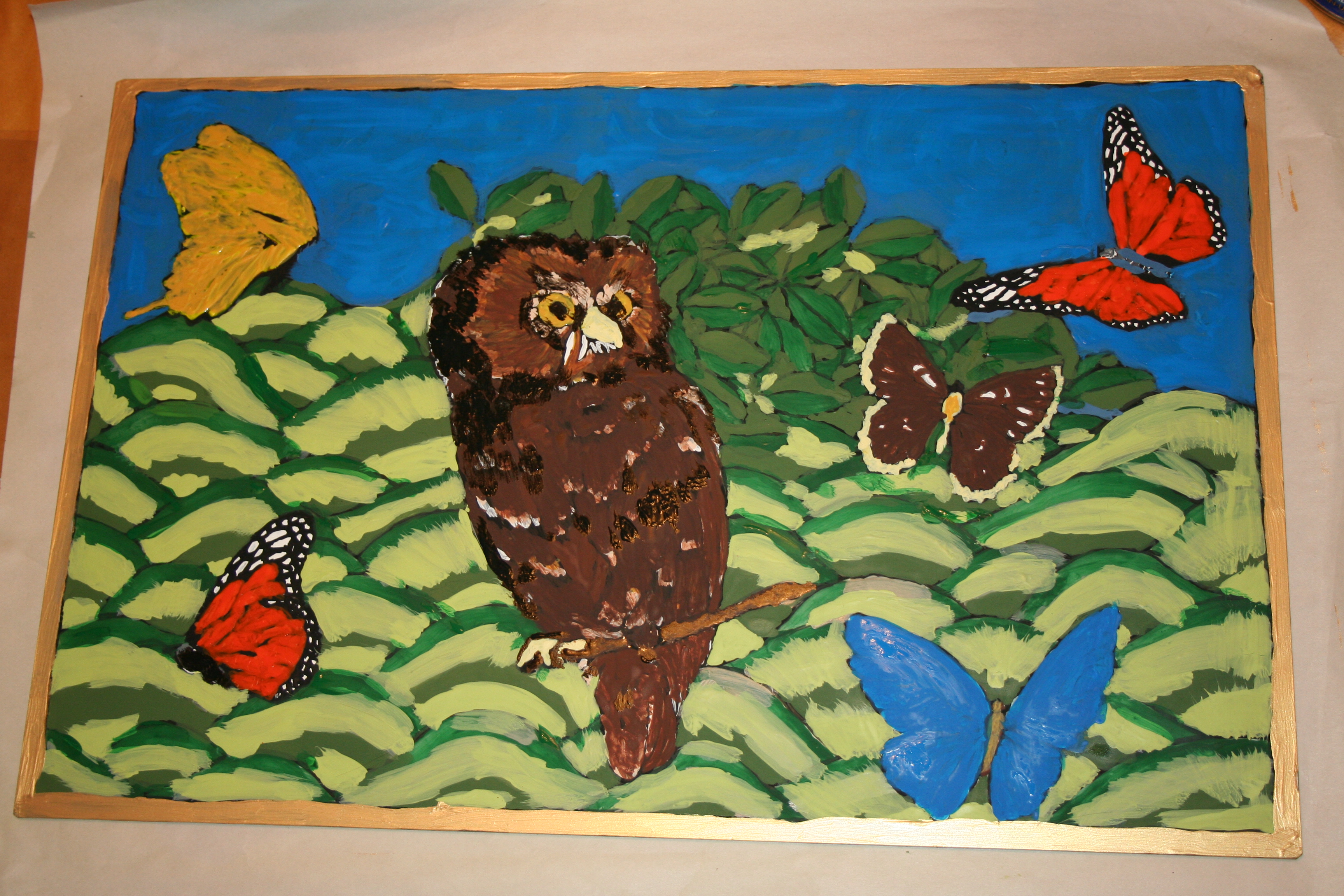 The “right” side of the glass. I should have painted more orange on the two butterflies, but I took artistic license with the whole design anyway, so who cares? The butterflies & owl are courtesy Dover Books. I love their copy-right free stuff.