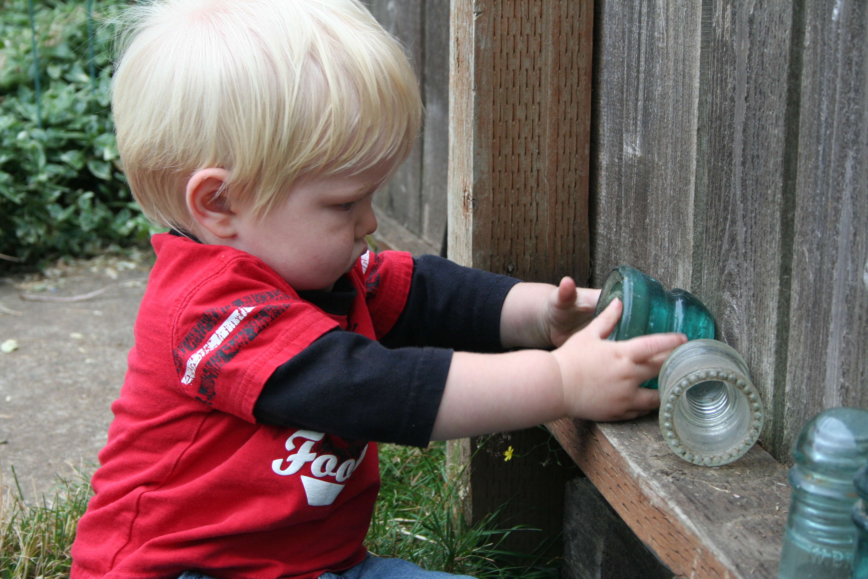 And this guy… His personality is just emerging. He’s more like his oldest brother at this stage than he is like Javan. I don’t recall Javes ever playing with the antique insulators on the fence but Z was always fascinated by them. Eli heads straight for them.
