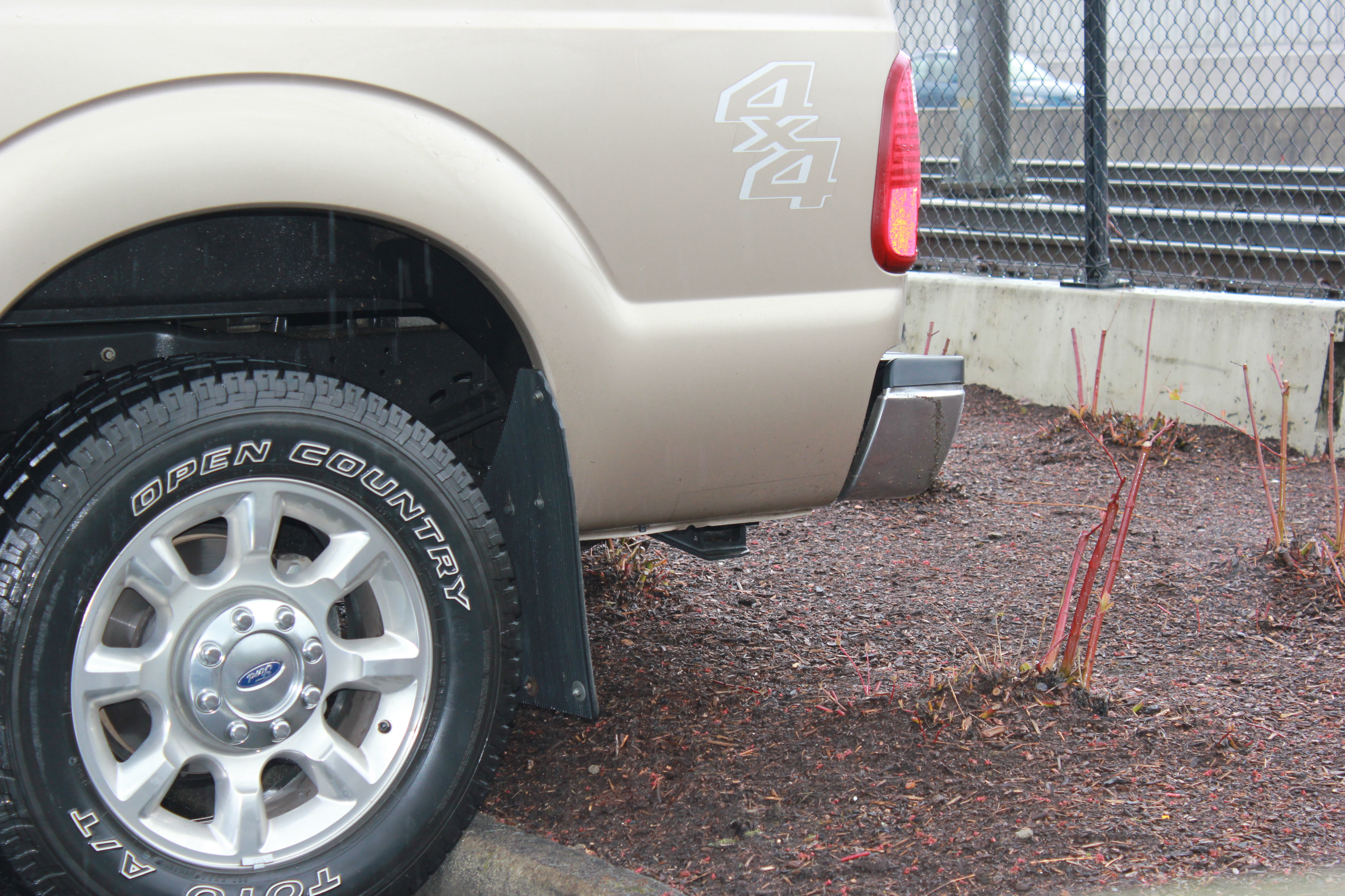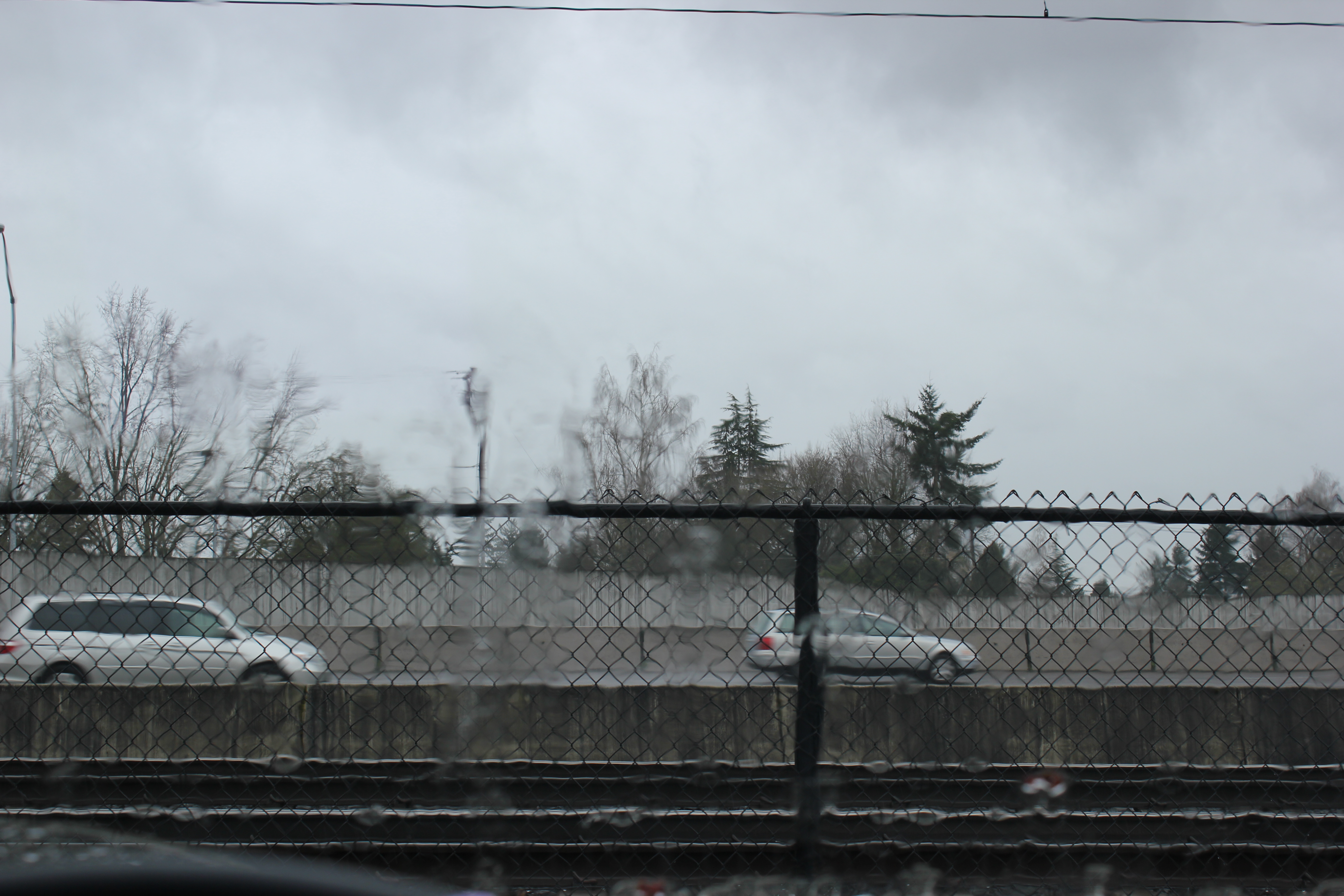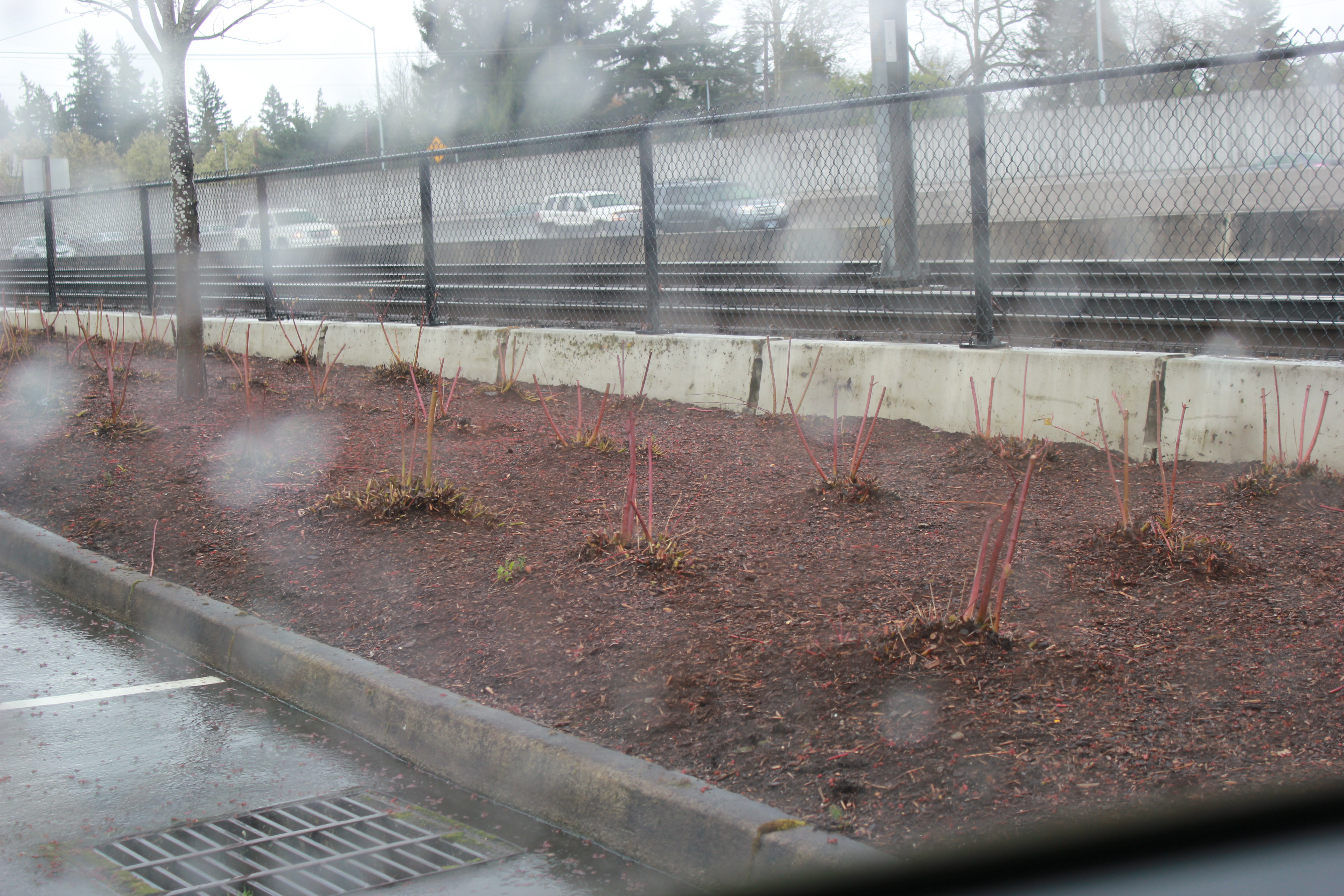 It was raining hard. I tried to get a photo of the paltry landscaping attempt. Apparently, there are roses planted all along the chain link fence. There are some skinny, young trees, too. All added as an afterthought.