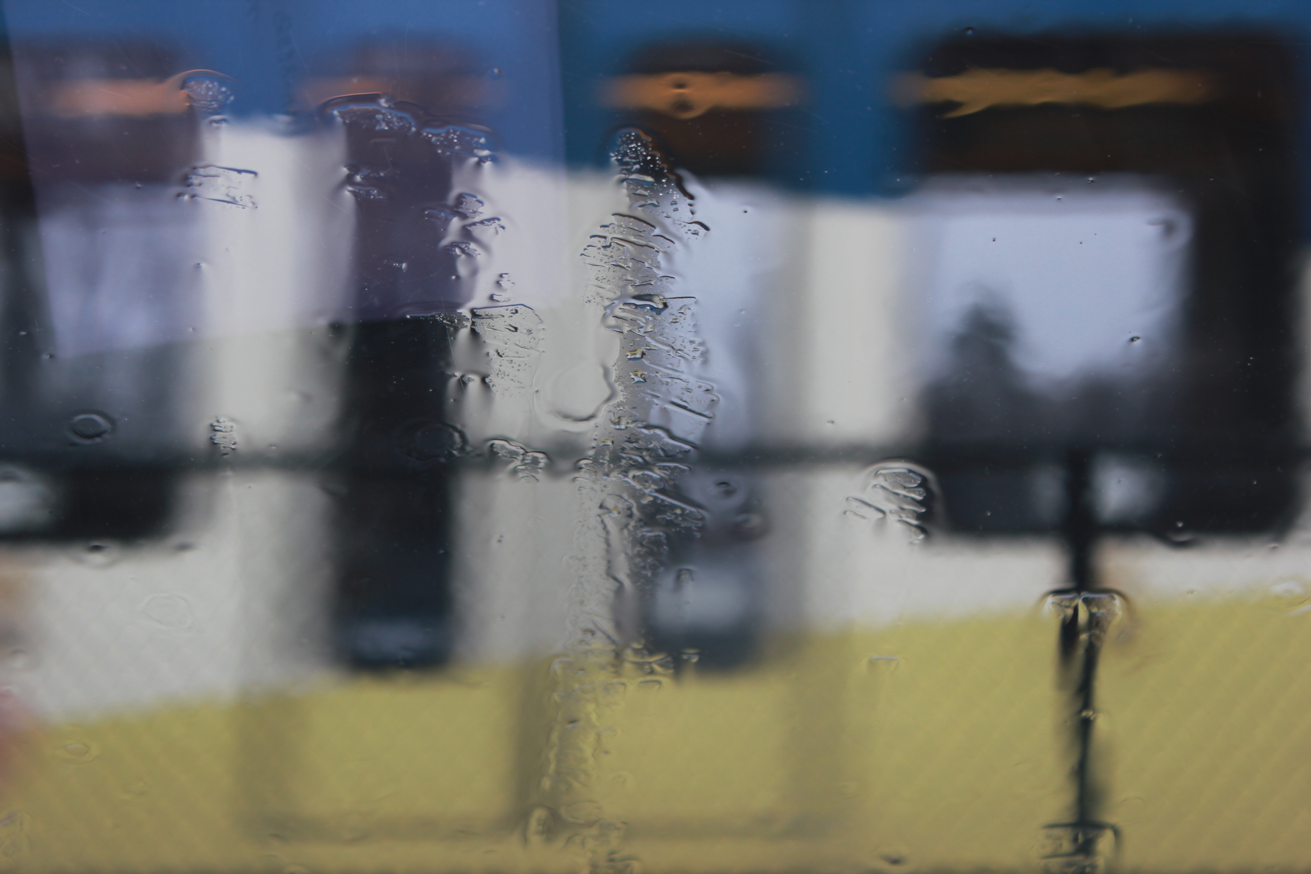 It comes by at a pretty good clip and I didn’t think to pan. My camera decided to focus on the rain on the windshield instead. I kind of like the effect and may have to try several more MAX train photos like this.